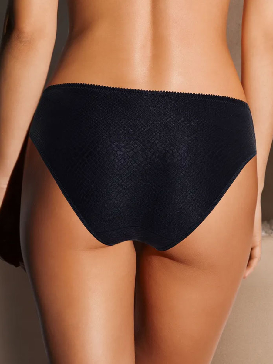 Трусики слипы - настоящее удовольствие для женского тела. Эластичное полотно с жаккардовым анималистичным рисунком «змейка» нежно обнимает ваши формы, а средняя посадка обеспечивает идеальный баланс комфорта и стиля. Темная синяя расцветка добавляет элегантности образу, делая вас еще более уверенной в себе.