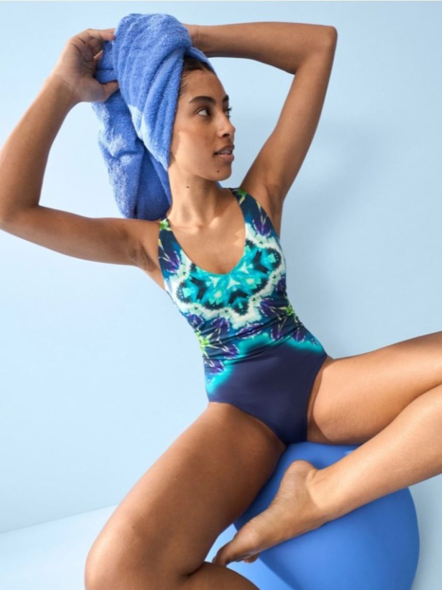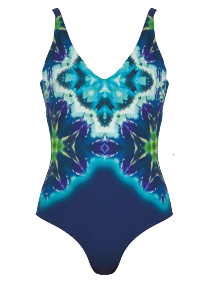 Слитный купальник с корректирующей подкладкой сеткой, верх с мягким поролоновым корректором, бретели регулируются. Выполнен из быстросохнущей ткани с абстрактным принтом, который зрительно "вытягивает" фигуру.