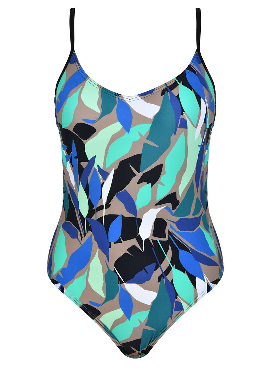 Купальный костюм Naturana на подкладе с эффектным принтом в виде разноцветной листвы. Чашки бескаркасные, уплотненные. Уплотнение в чашках можно удалить. Однотонные бретели гармонирующего оттенка регулируются по длине и отстегиваются на спинке.
