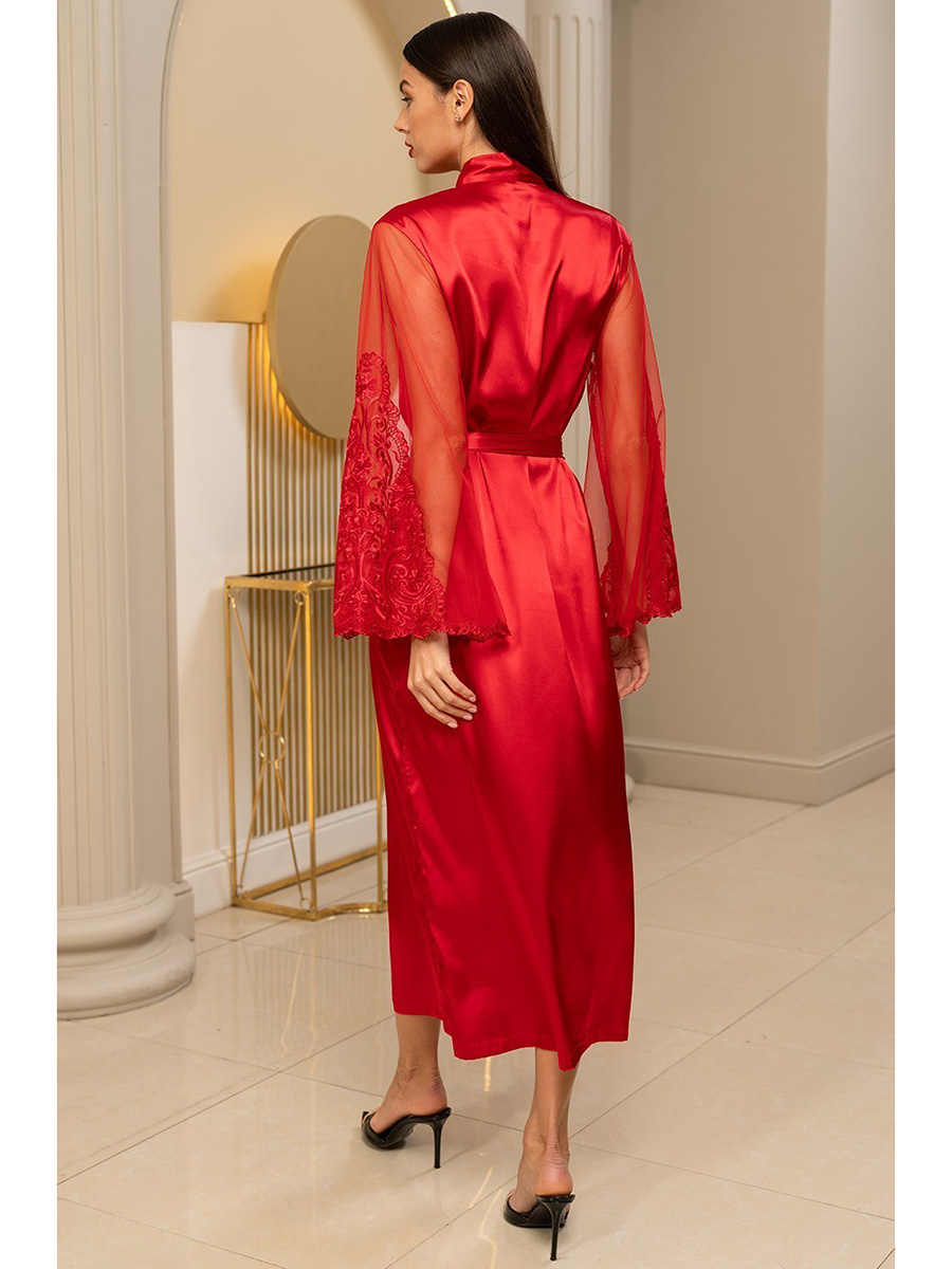 Длинный запашной халат Mia-Amore с длинными широкими рукавами выполнен из принтованного смесового шёлка. Широкие рукава халата выполнены из мягкой сетки и декорированы кружевными вставками. Халат комплектуется широким поясом, в боковых швах карманы.
