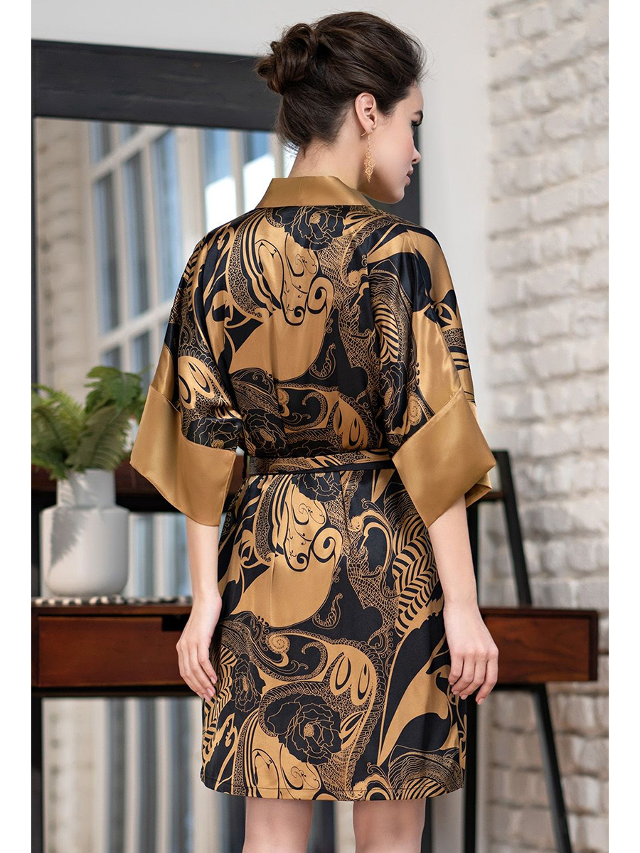 Короткий халат Mia-Amore выполнен из смесового принтованного шелка. Планка халата и низ рукавов декорированы отделкой из однотонного атласа. Халат с поясом и карманами в боковых карманах.