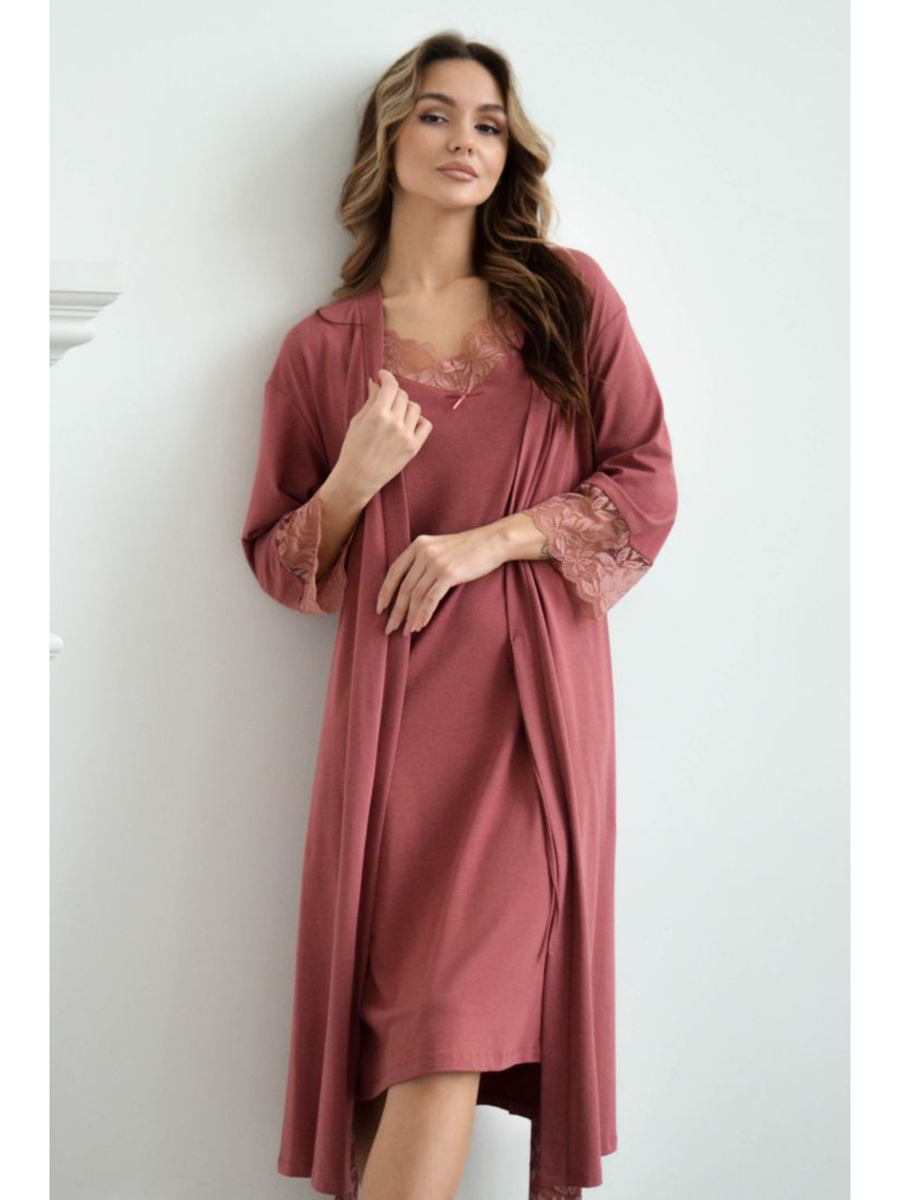 Укороченный пеньюар с рукавом ¾ идеально дополнит образ к сорочкам на тонкой бретели. Рукав и пояс изделия декорированы широким кружевом. Линия плеча приспущена.