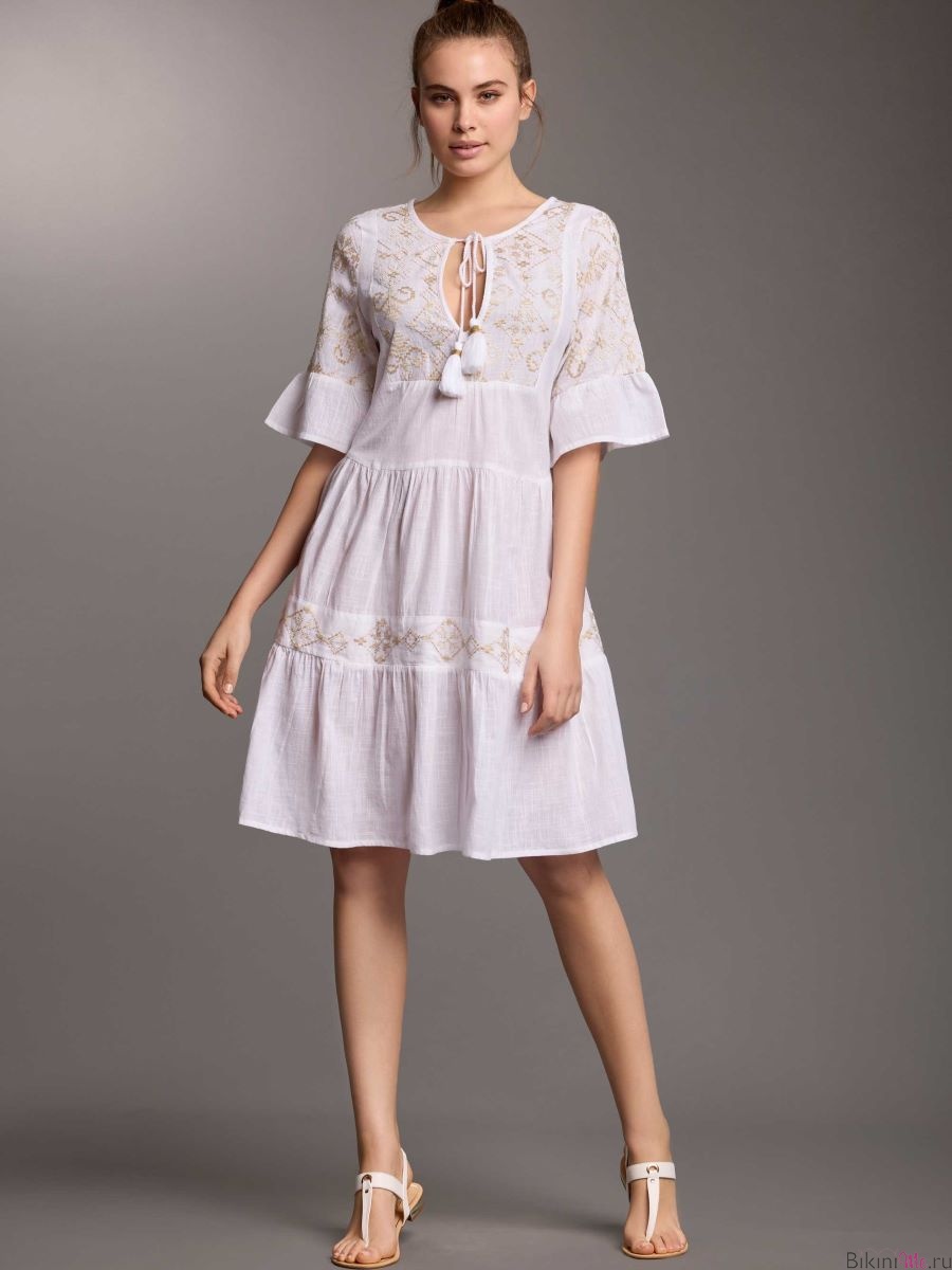 Платье-туника с отрезным верхом и свободной юбкой, легкая хлопковая ткань украшена вышивкой