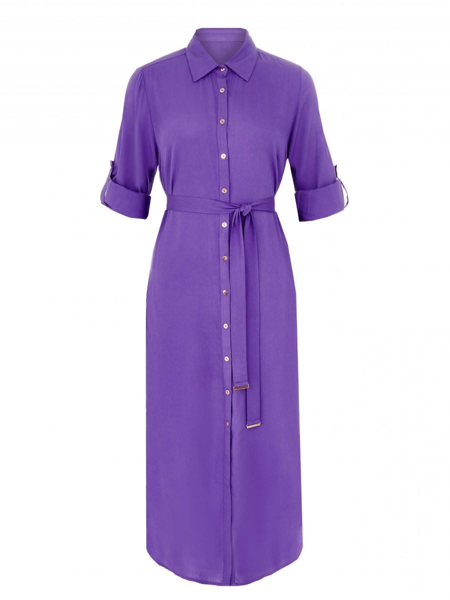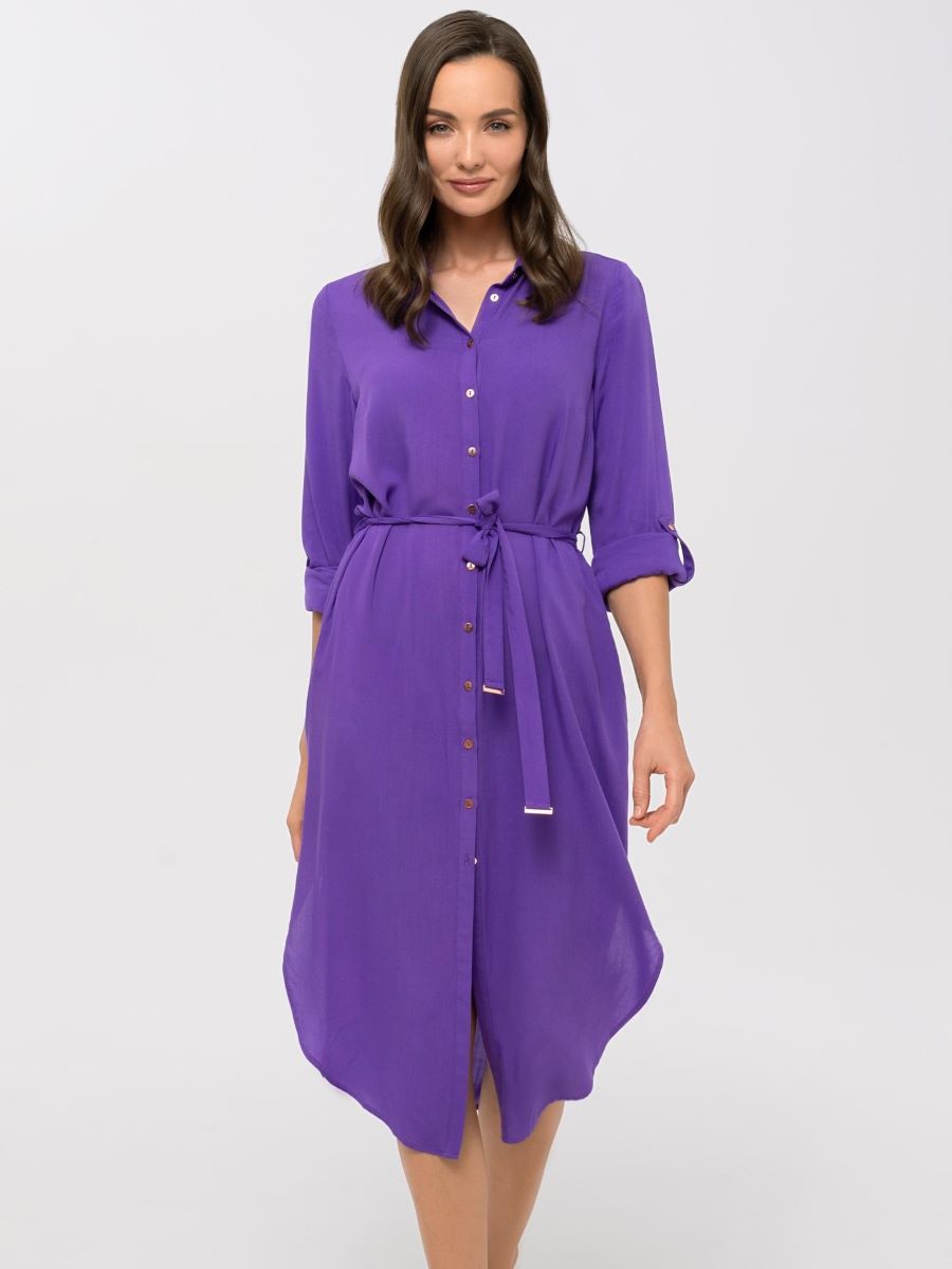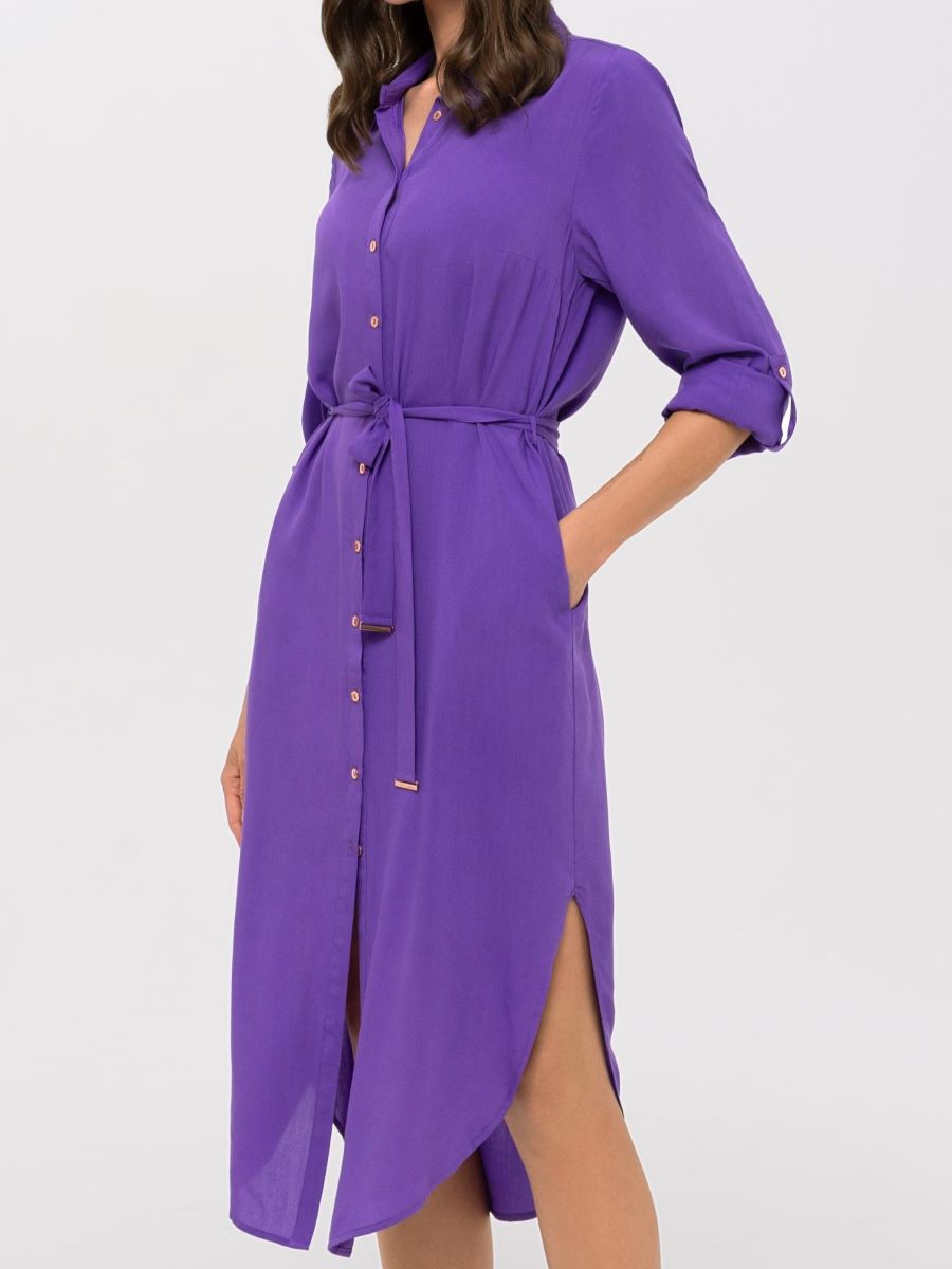 Платье-рубашка на пуговицах из дышащей, мягкой вискозной ткани. Актуальная длина миди. Закругленный подол с разрезами по бокам. Отложной воротник. Длинные рукава с манжетами на пуговицах. Длина рукава регулируется патой с застежкой. Съемный пояс с золотыми пряжками.