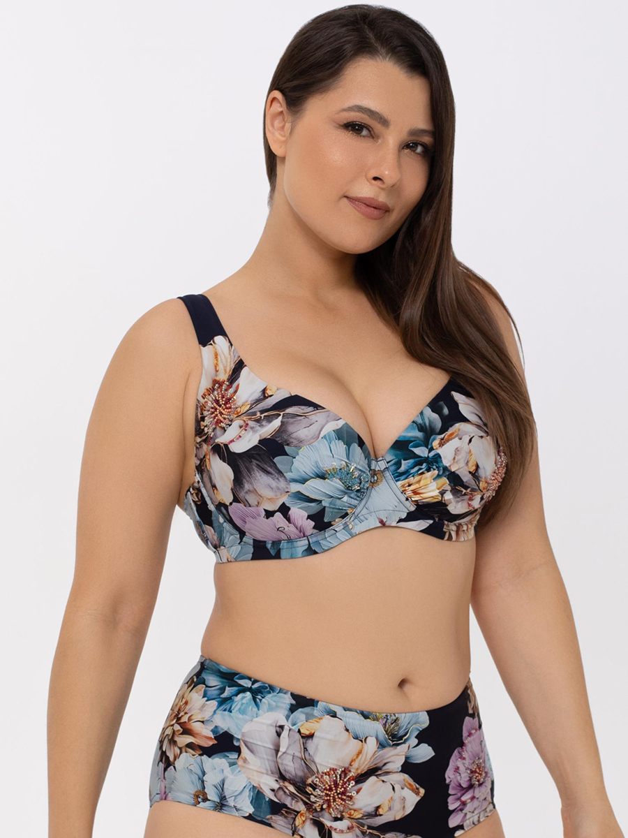 Раздельный купальник с формованной чашкой на косточках, подойдет для обладательниц пышных форм. Углубленная линия декольте, широкие регулируемые бретели с поролоновой вставкой, на спине застежка.