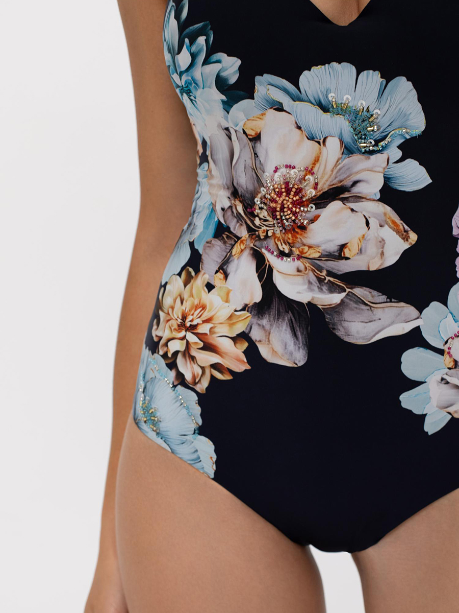 Сплошной купальник с формованной чашкой «бандо» на косточках. Съемные регулируемые бретели. Застежка на спине. Открытая спина. На передней детали «Placement» принт.