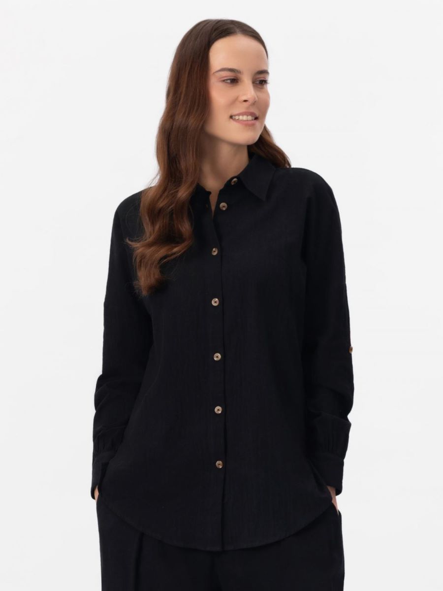 Рубашка из мягкого хлопка свободного силуэта, застёгивается на пуговицы. Длина — до середины бедра. Втачной рукав с манжетами, длина регулируется с помощью паты на застёжке.
