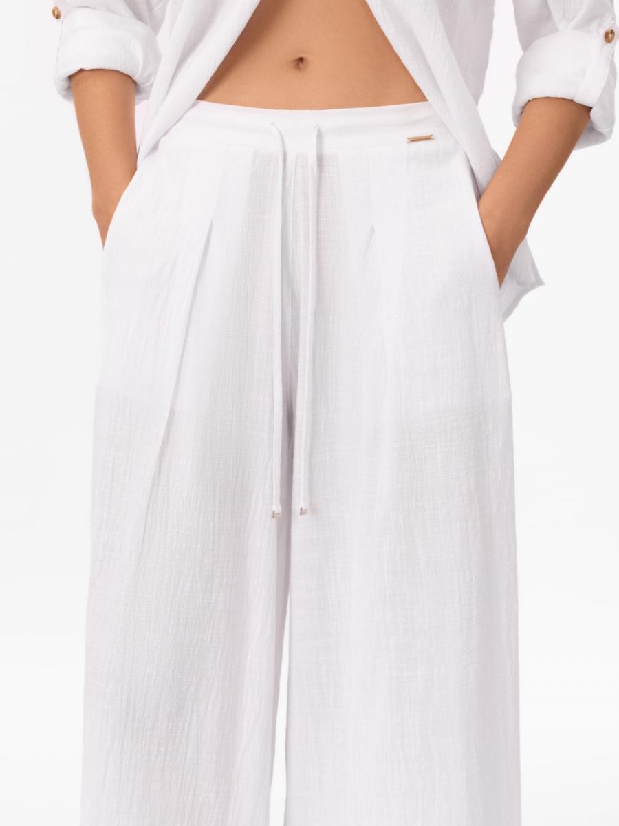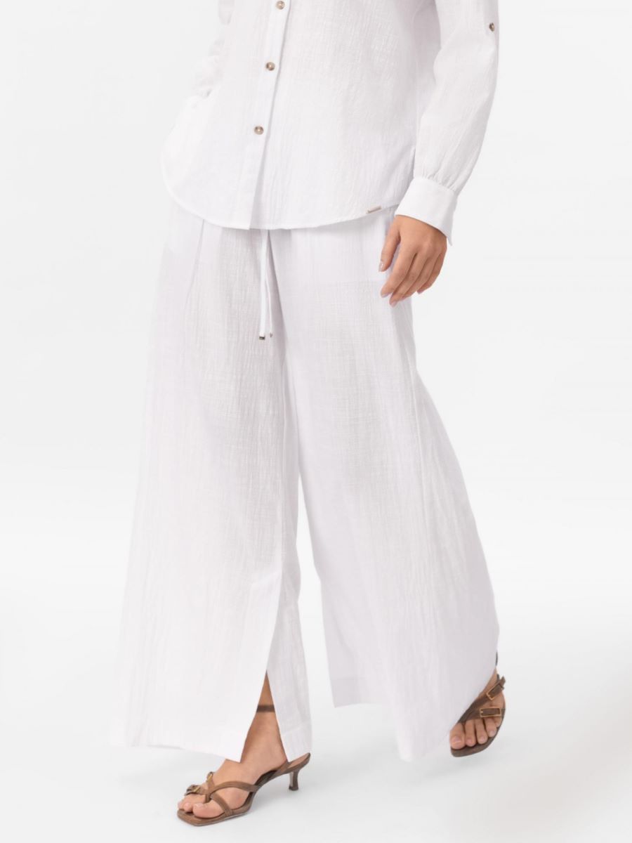 Брюки прямого кроя из лёгкого хлопка. Пояс на кулиске с эластичной вставкой сзади обеспечивает комфортную посадку. Боковые карманы добавляют функциональности, а небольшие разрезы во внутренних швах по низу придают образу изящную динамику.