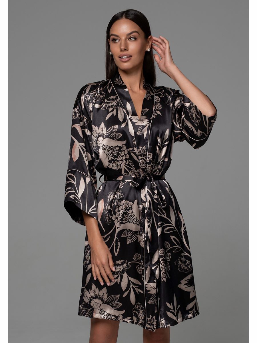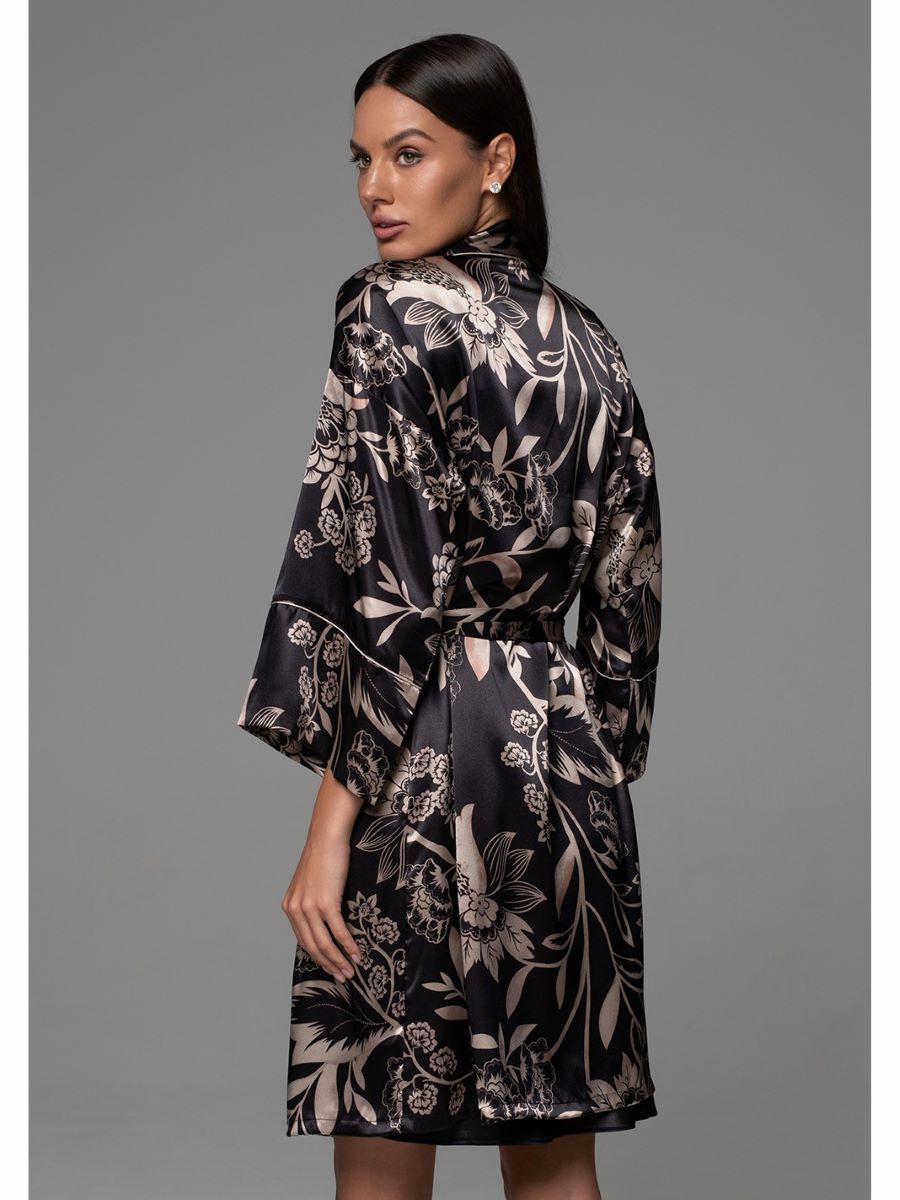 Короткий халат–кимоно выполнен из принтованного смесового шелка. По бокам расположены карманы. В комплекте идет пояс, чтобы приталить силуэт халата и подчеркнуть элегантный образ.