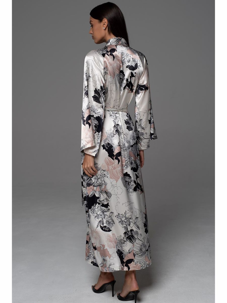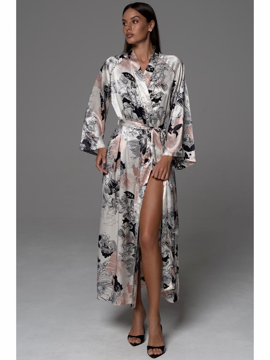 Длинный запашной халат с широким длинным рукавом. Халат выполнен из принтованного смесового шелка с отделкой в виде канта по бортам. По бокам расположены карманы.