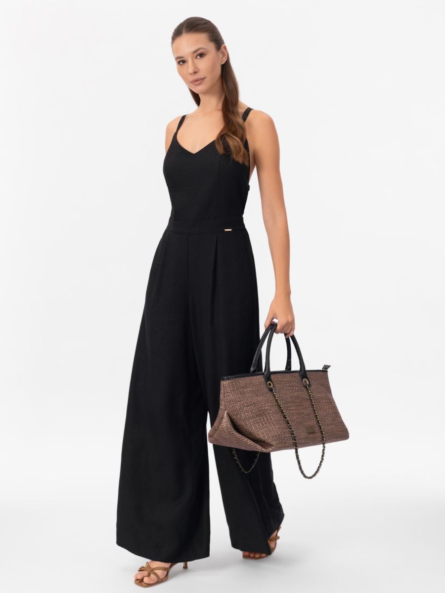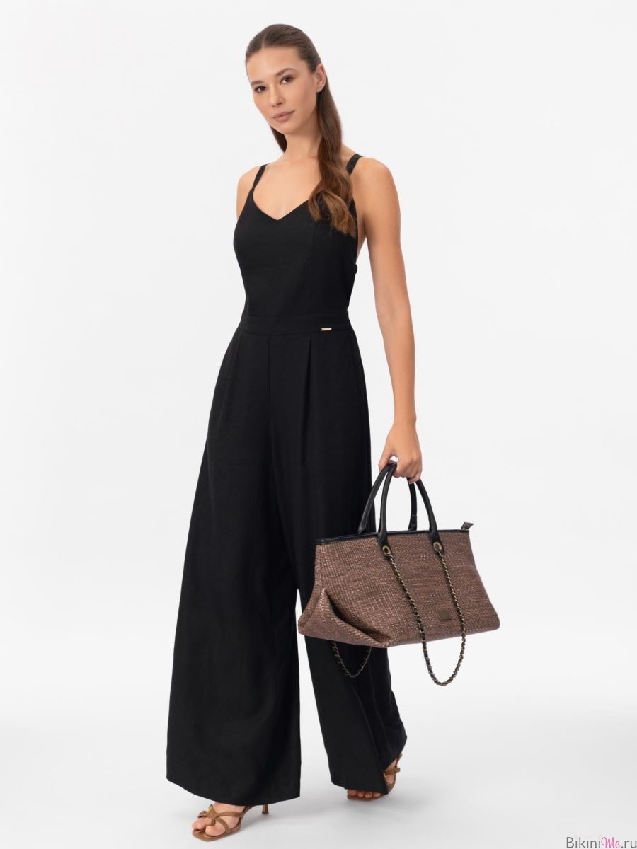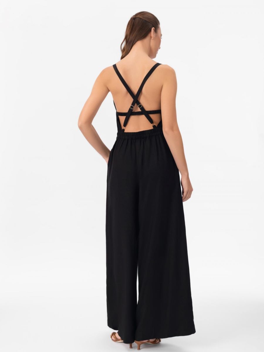 Лёгкий комбинезон из смеси льна и вискозы с элегантной V-образной линией декольте. Брюки слегка расклешены книзу, а боковые карманы добавляют функциональности. Открытая спина подчёркнута эластичной лентой, фиксирующей вырез, а регулируемые бретели крест-накрест на спине позволяют идеально подогнать посадку.