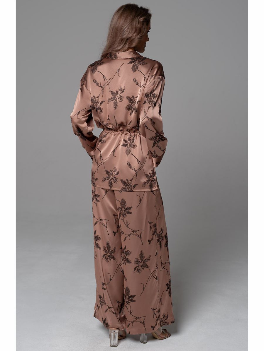 Комплект состоит из рубашки с центральной потайной застёжкой на пуговицы и длинными рукавами, и брюк. Комплект выполнен из жаккардового двухцветного смесового шёлка. На рубашке утягивающая кулиса по талии. Широкие брюки с эластичным поясом и с боковыми карманами.