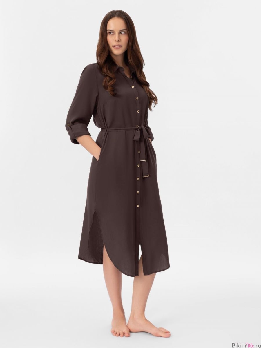 Платье-рубашка на пуговицах из дышащей, мягкой вискозной ткани. Актуальная длина миди. Закругленный подол с разрезами по бокам. Отложной воротник. Длинные рукава с манжетами на пуговицах. Длина рукава регулируется патой с застежкой. Съемный пояс с золотыми пряжками.