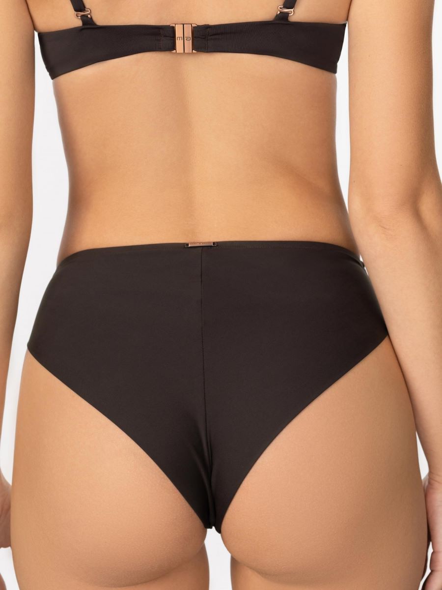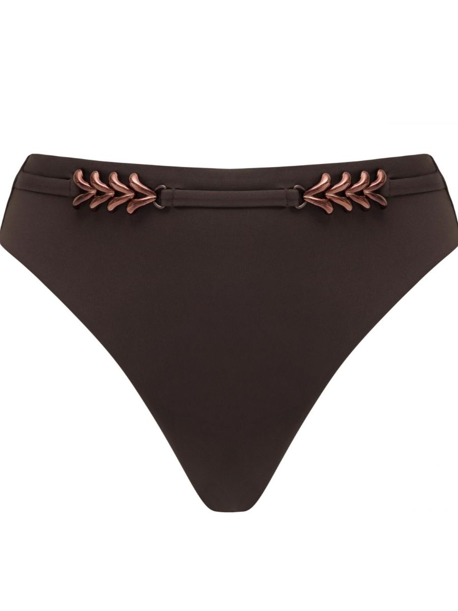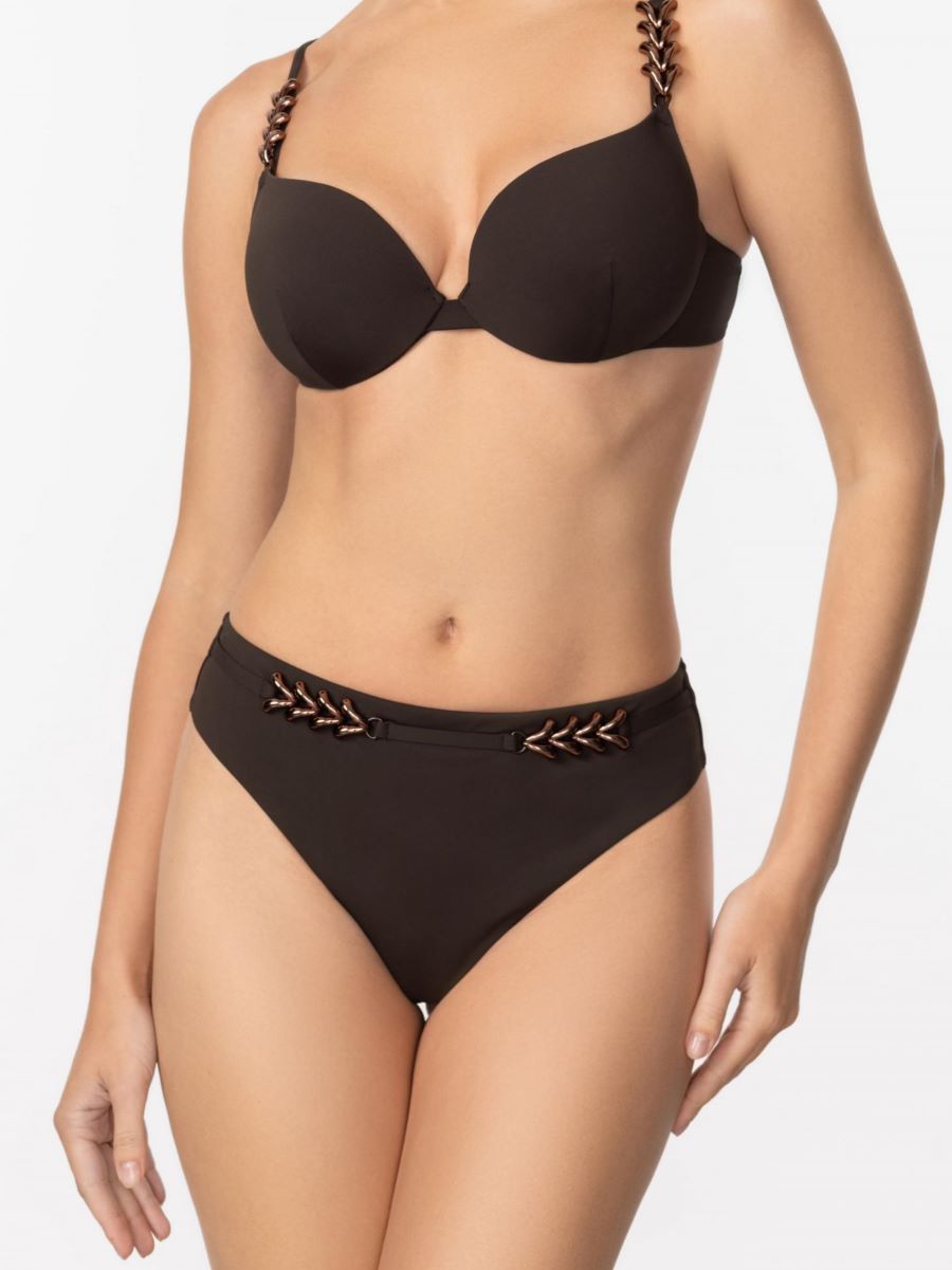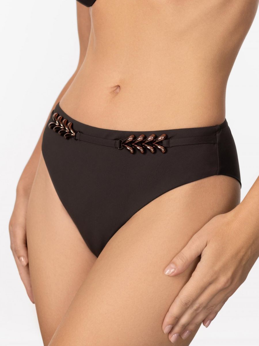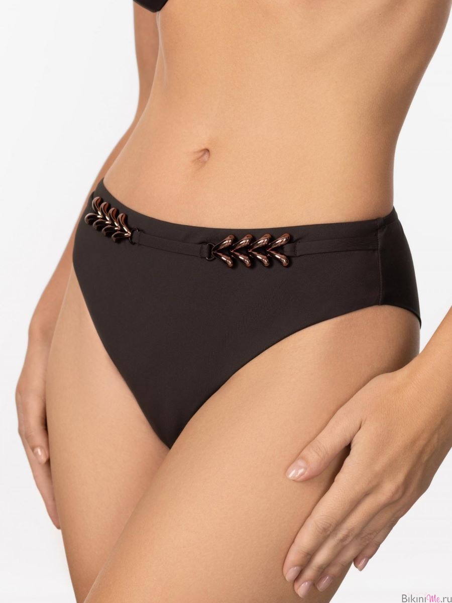 Брифы-бразилиана с завышенной линией талии гармонично подчеркивают фигуру и визуально удлиняют силуэт. На передней детали расположен декоративный пояс с изысканными аксессуарами, добавляющий образу утончённости и стиля.