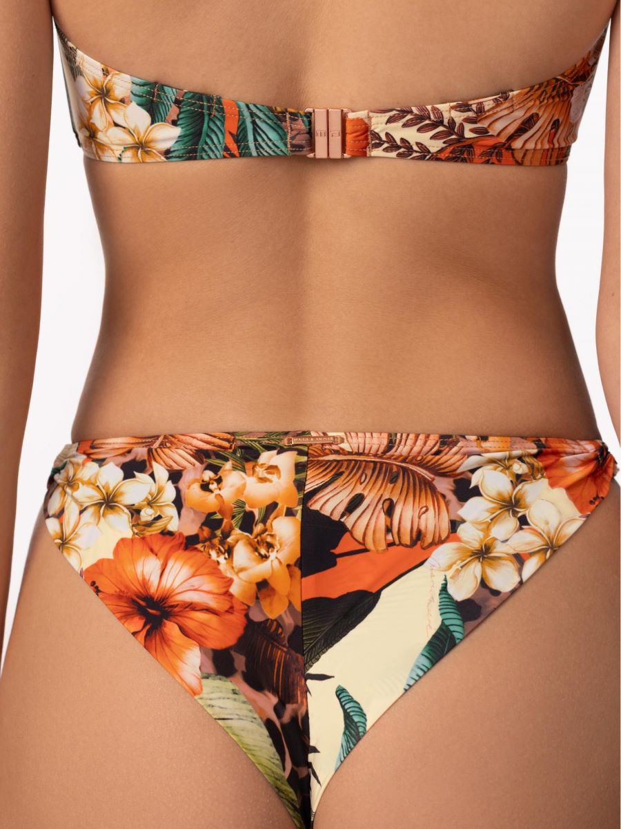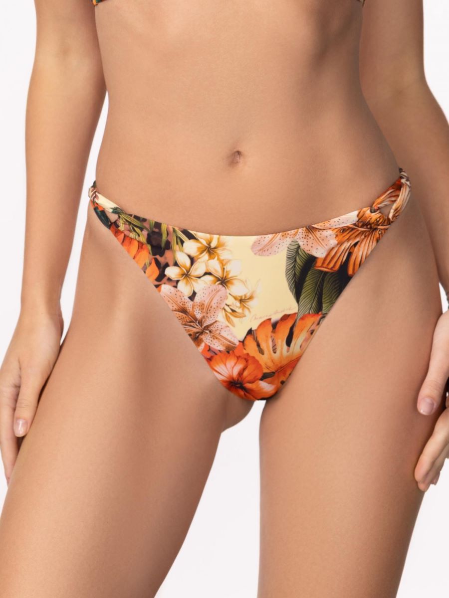 Брифы-бразилиана с заниженной линией талии. По бокам декоративные перекруты. Завышенный вырез по линии бикини. Обработка задней детали в подворот с чистым краем.
