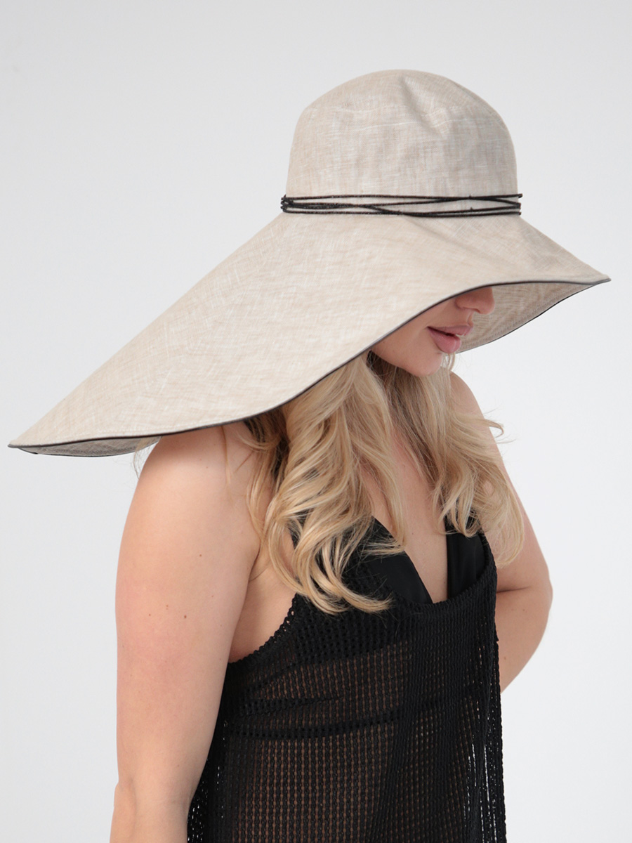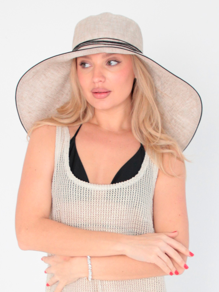 Шляпа с ассиметричными широкими полями, изготовлена из льна — натурального экологически чистого материала.