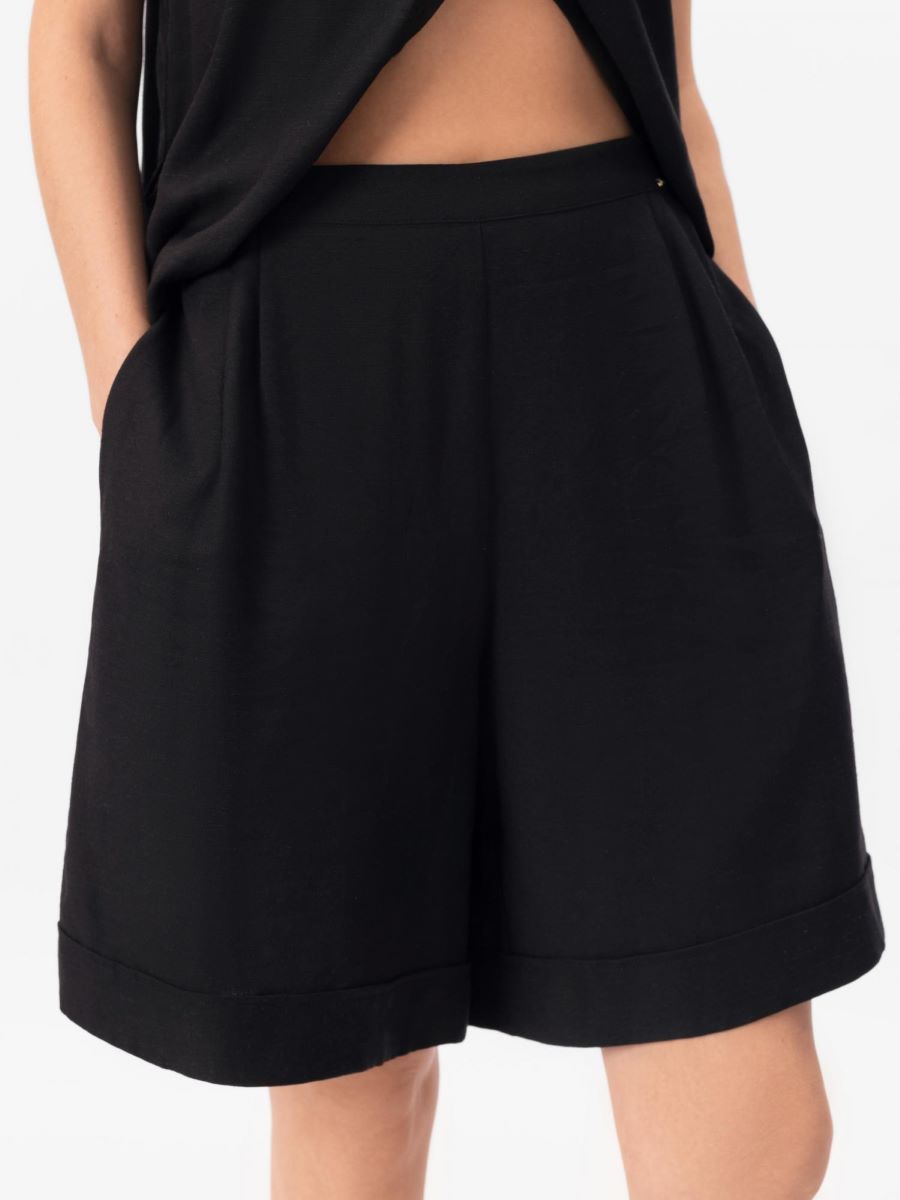 Лёгкие шорты-бермуды из смеси льна и вискозы с завышенной талией создают элегантный и современный силуэт. Боковые карманы добавляют практичности, а свободный крой обеспечивает комфорт и лёгкость в жаркую погоду.
