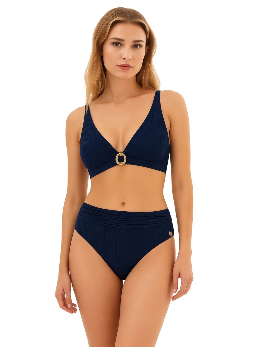 Плавки классической посадки слип из однотонной ткани с мелкой фактурной полоской. Модель с подкладкой обеспечивает дополнительный комфорт и надёжную посадку, а лёгкая драпировка по верху передней детали добавляет изящества дизайну, деликатно подчёркивая силуэт без излишней вычурности. Практичный фасон сочетается с лаконичным стилем и подходит для активного отдыха и расслабленного времяпрепровождения у воды.