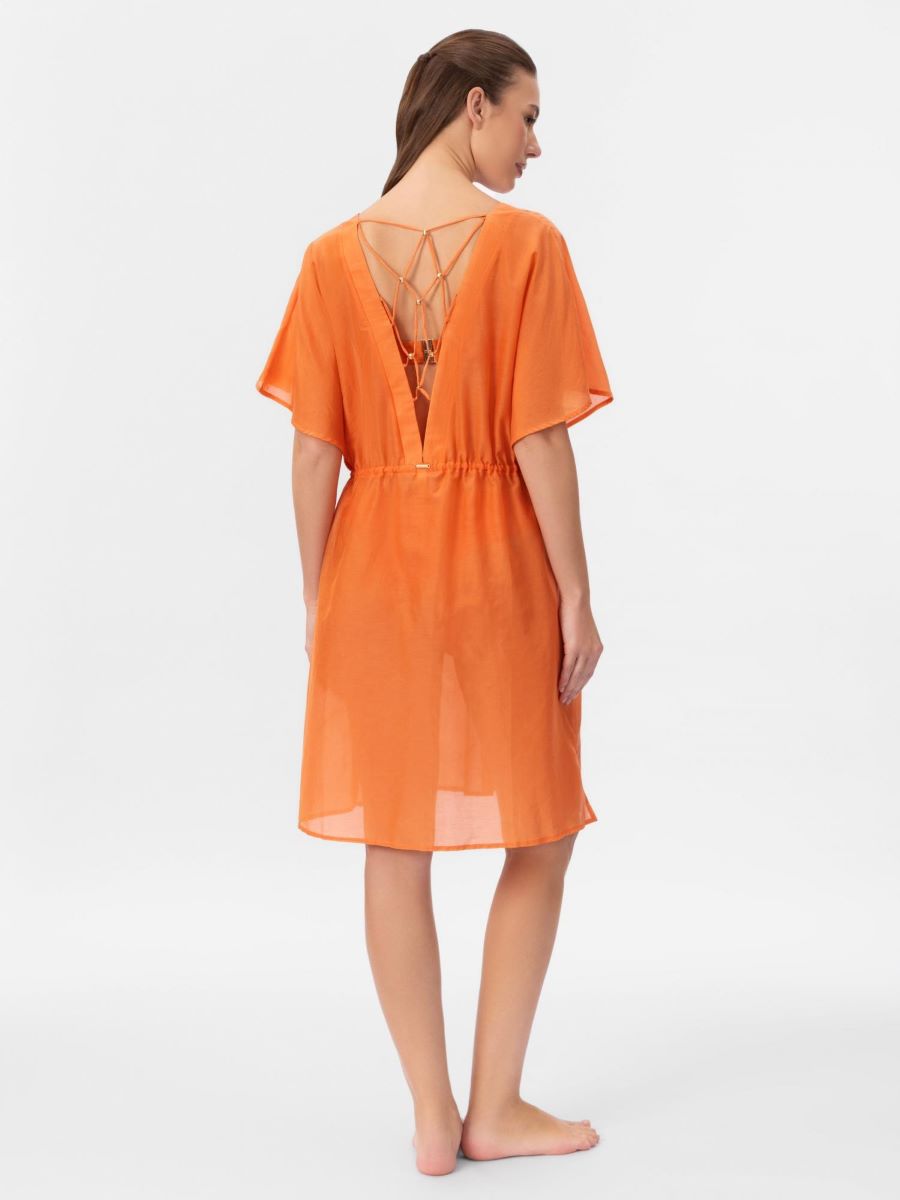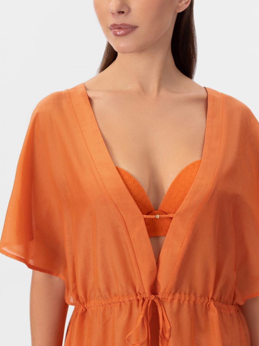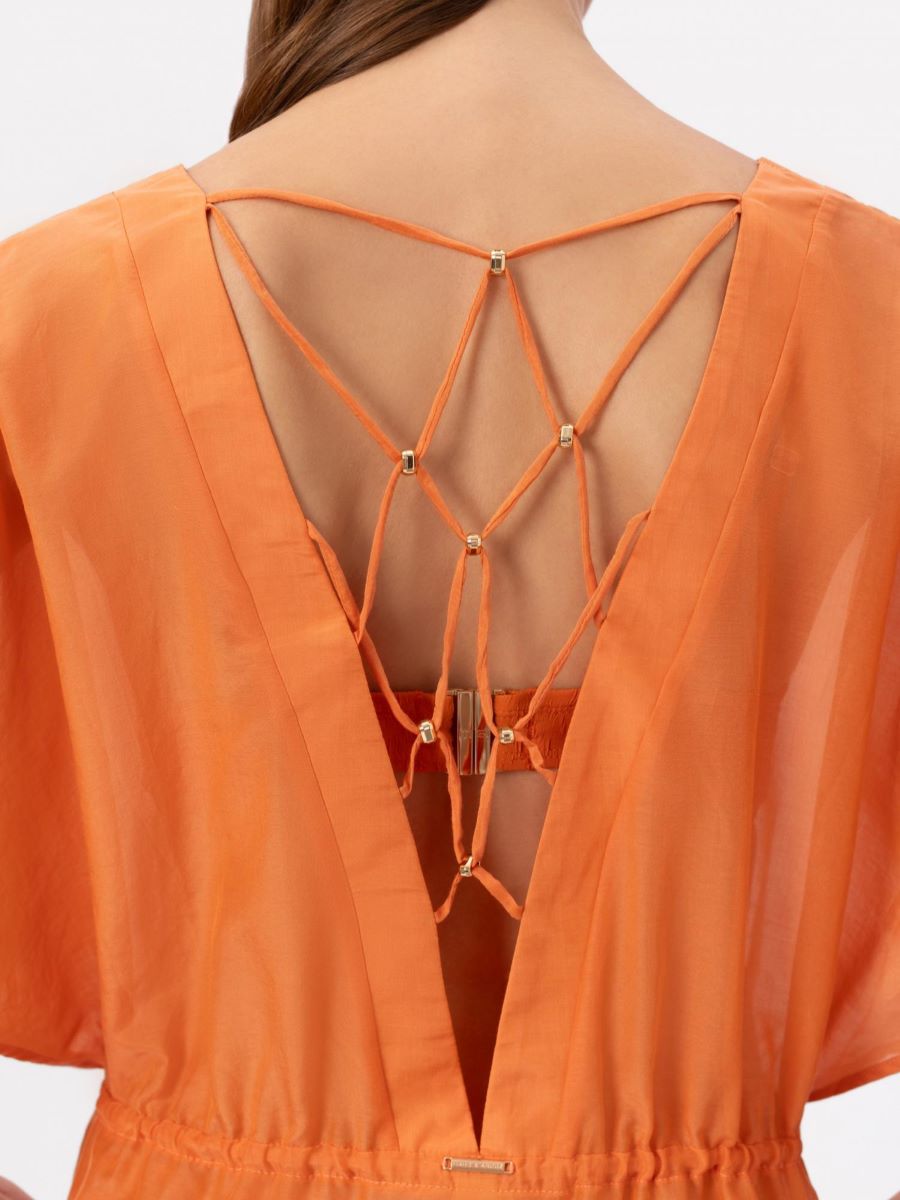 Туника свободного кроя из шелка и хлопка. Линия талии регулируется кулиской. Открытая спина. Фантазийная декоративная сетка из вытачного шнура и аксессуаров.