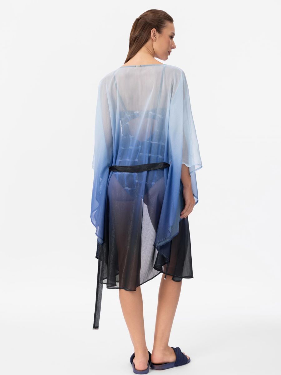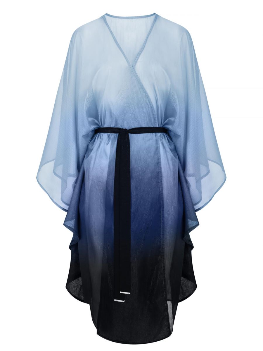 Туника свободного кроя с эффектом омбре, длина до уровня колен. V-образный вырез горловины. Рукава напоминают крылья бабочки. Съемный пояс. «Placement» принт.