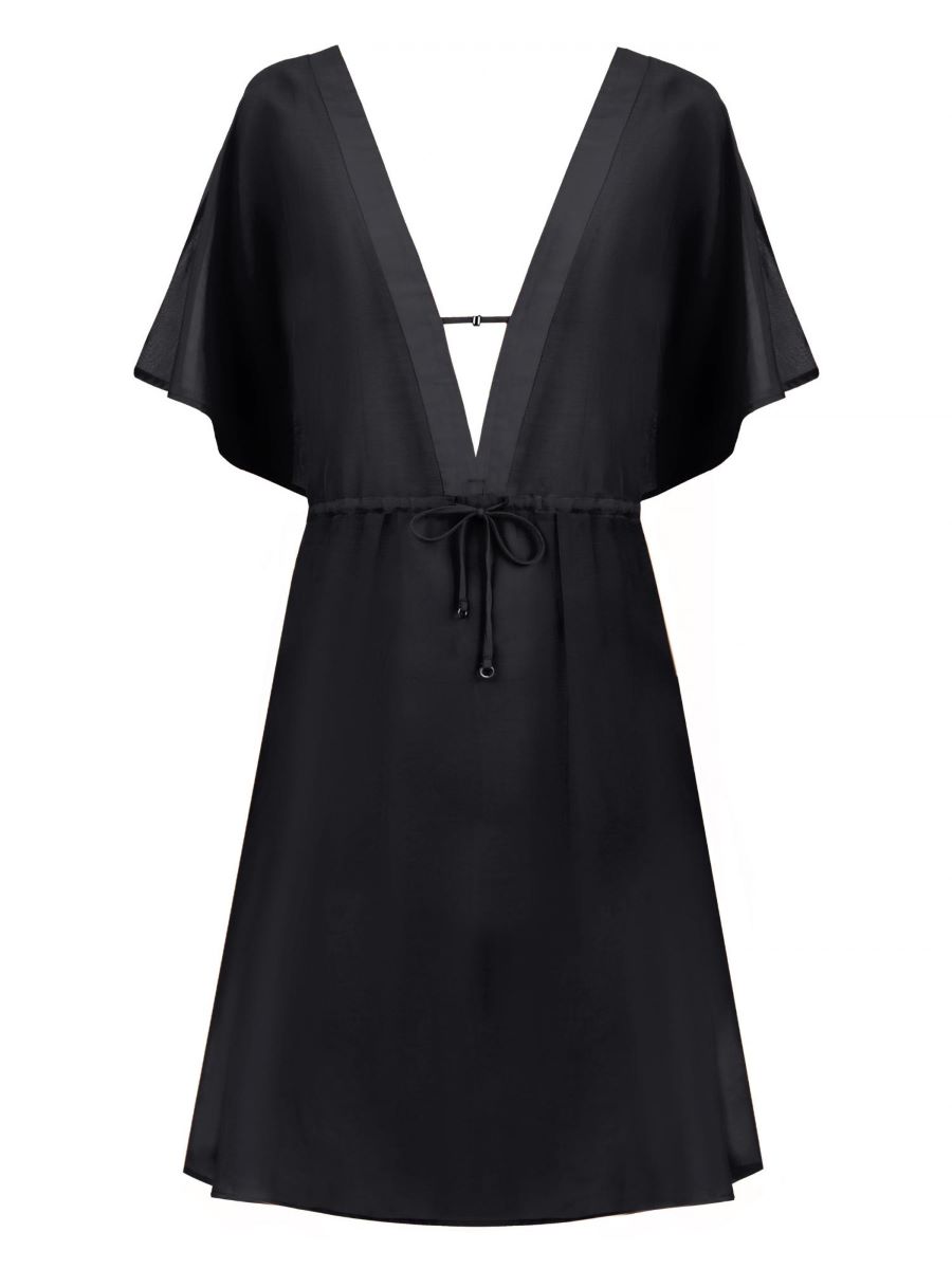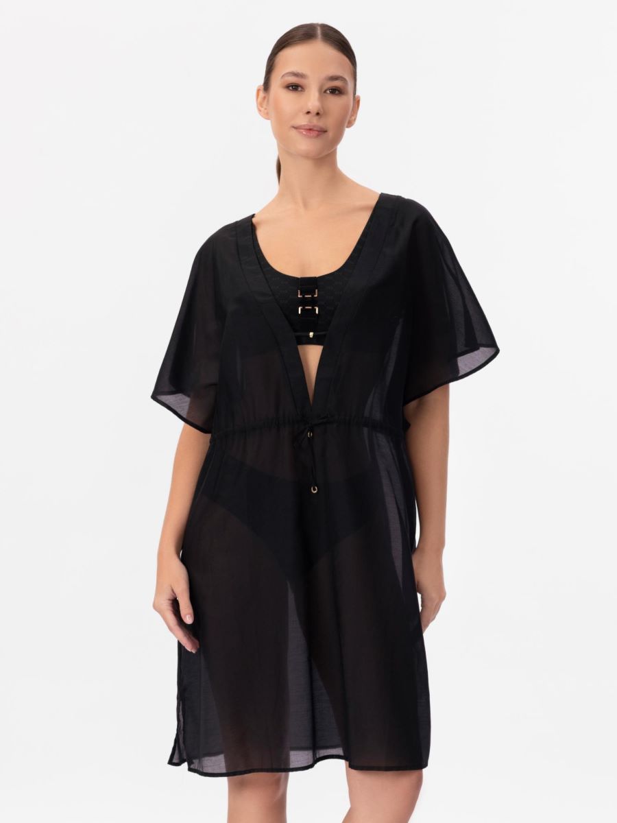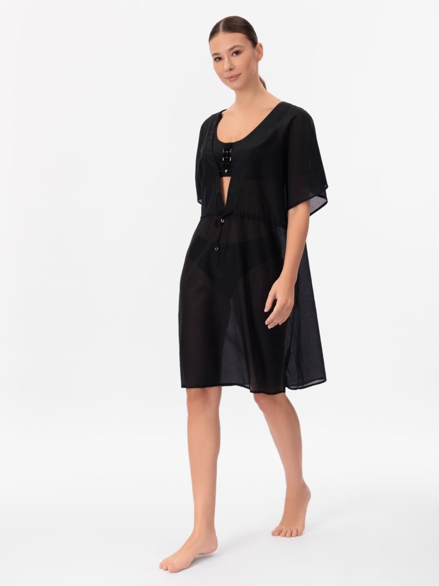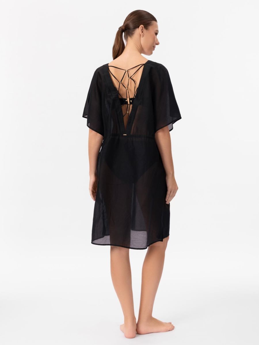 Туника свободного кроя из шелка и хлопка. Линия талии регулируется кулиской. Открытая спина. Фантазийная декоративная сетка из вытачного шнура и аксессуаров.