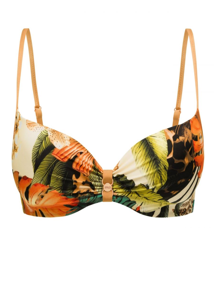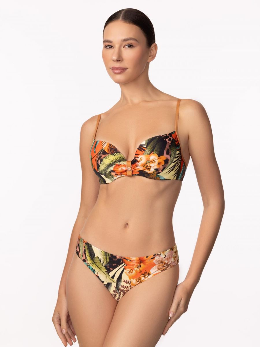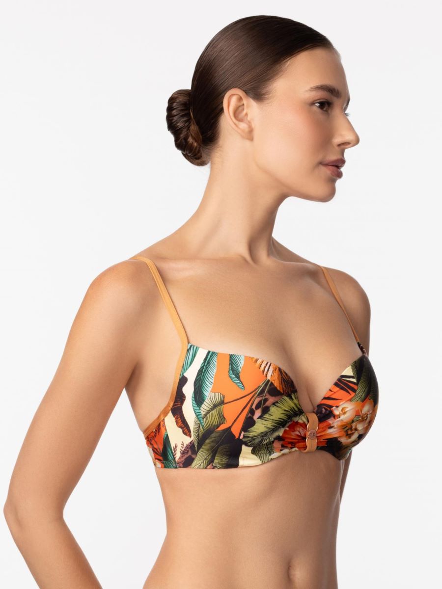Формованная чашка на косточках со съемными корректорами «пуш-ап». По центру между чашек легкая драпировка и аксессуар. Бретели регулируются, на спине застежка.