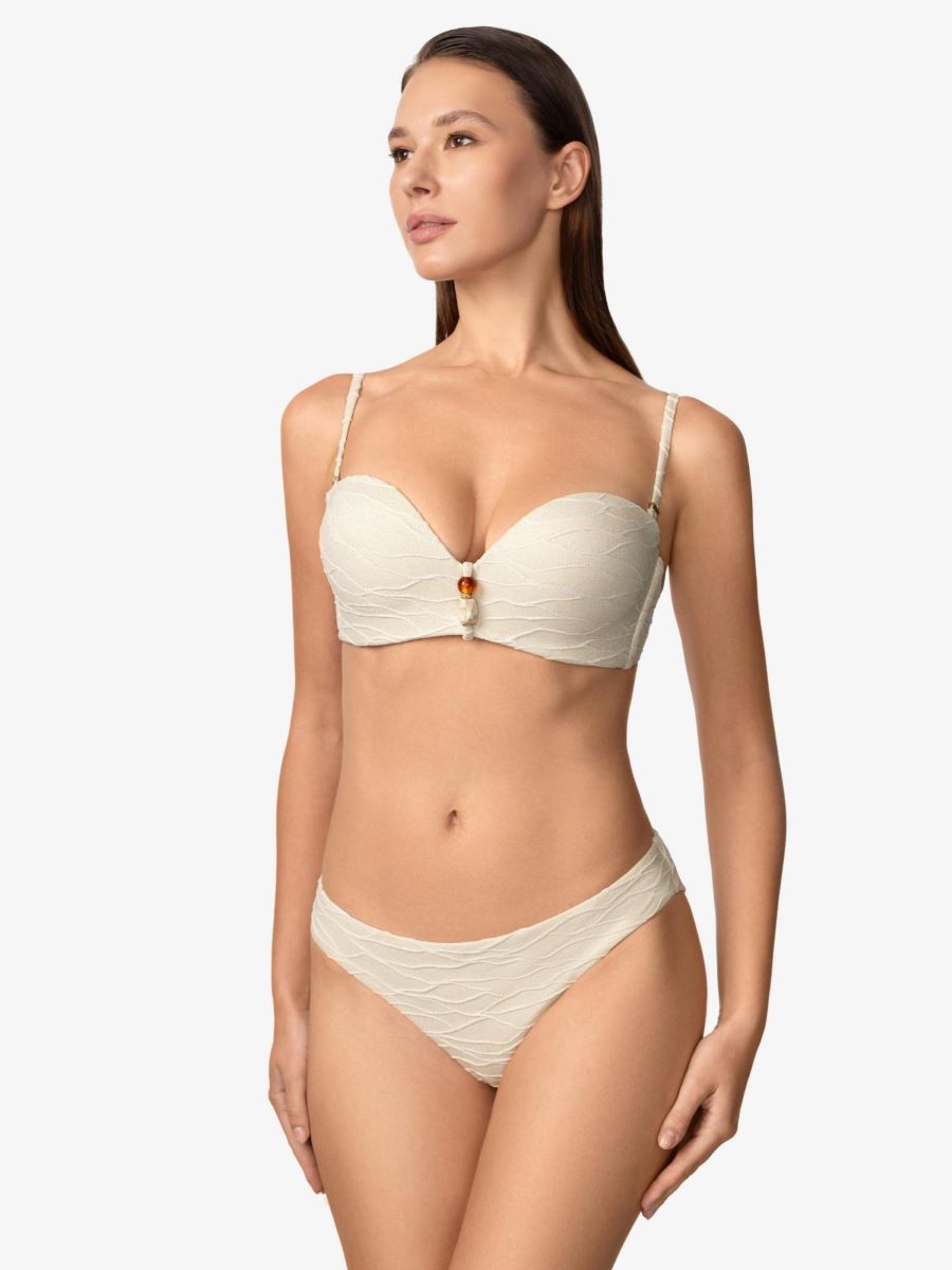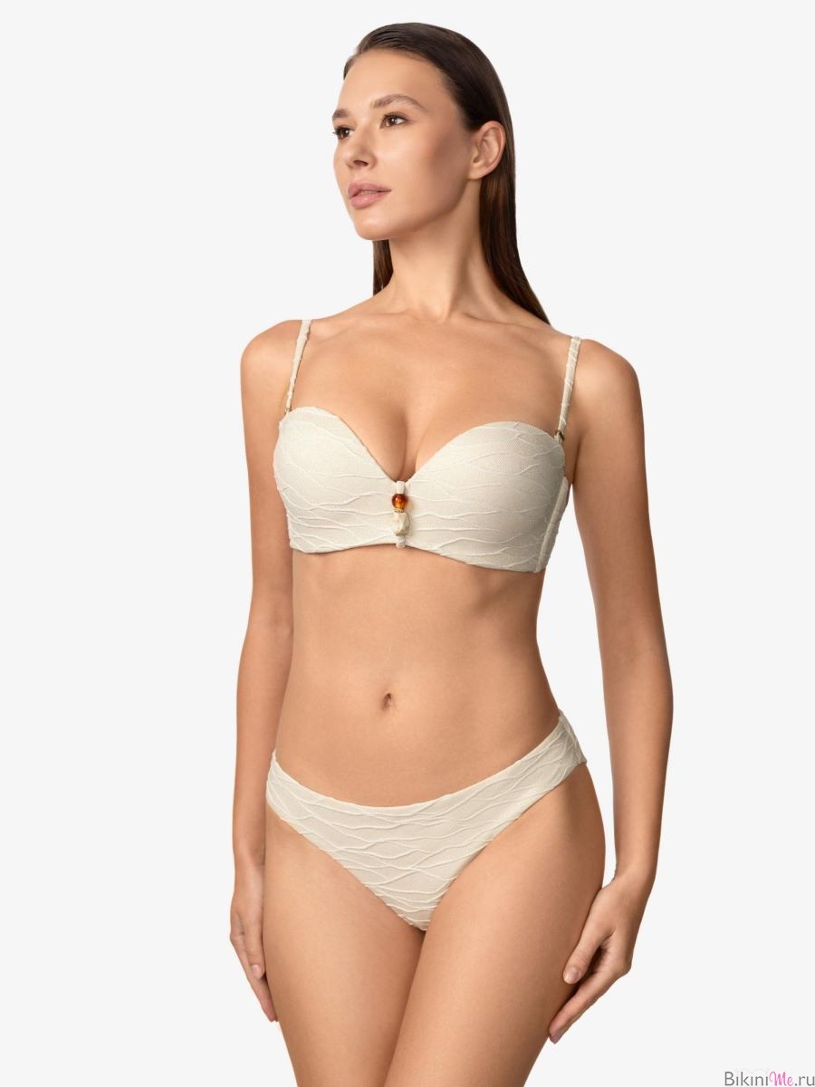Бескаркасная чашка «бандо» со встроенным «пуш-ап» создаёт соблазнительный силуэт. Эффект «скрытого каркаса». Уплотнённый стан обеспечивает комфорт и надёжную поддержку, а силиконовая лента по верхнему краю фиксирует посадку. По центру между чашек расположен аксессуар, добавляющий элегантный акцент, а регулируемые съёмные бретели и застёжка на спине гарантируют идеальную посадку.