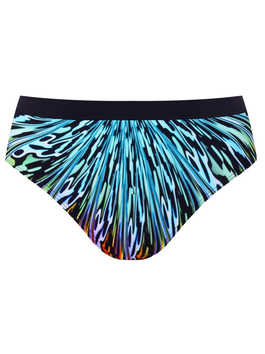 Плавки слипы с завышенной посадкой и однотонным эластичным поясом, выполнены из быстросохнущего материала с абстрактным принтом. Внимание, продаются только вместе с бюстом в том же размере!