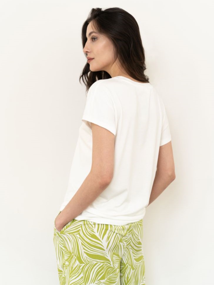 Нежная футболка со спущенным коротким рукавом из вискозы изящно дополнит образ к любым летним брюкам и шортам. Вырез горловины круглый, что делает ее универсальной.