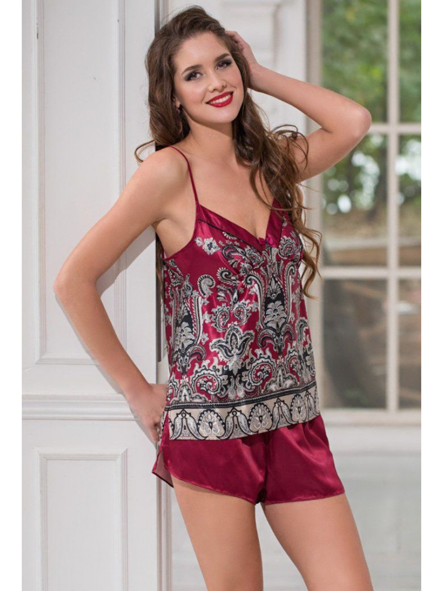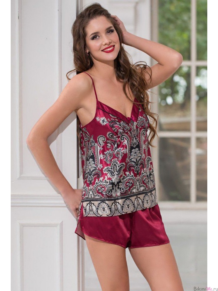 Комплект Mia-Amore состоит из топа и шорт. Топ выполнен из смесового шелка с купонным притом, а шорты из однотонной ткани. По бокам шорт расположены карманы, а понизу разрезы.