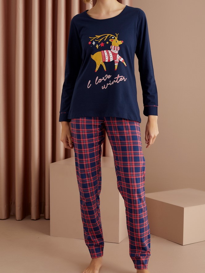 Пижама из хлопковой ткани, верх с округлым вырезом и принтом, длинные брюки на резинке.