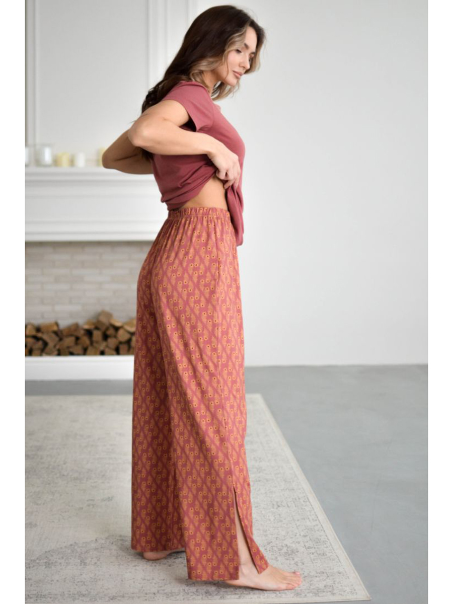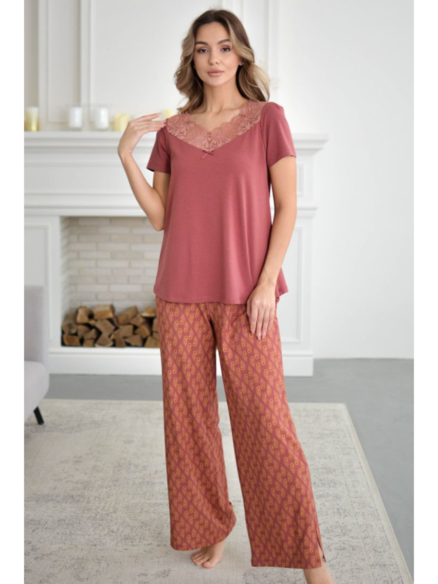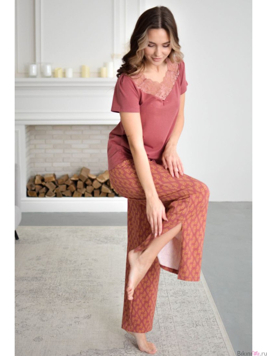 Элегантная пижама, состоящая из футболки и брюк свободного прилегания с разрезами по низу.Футболка декорирована кружевным лифом