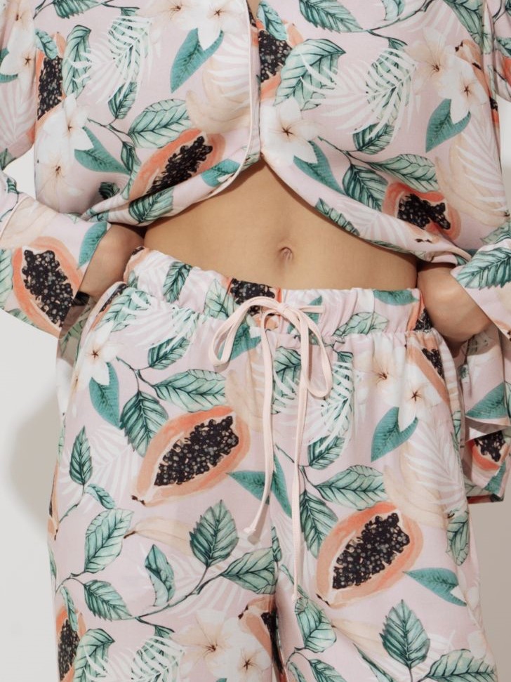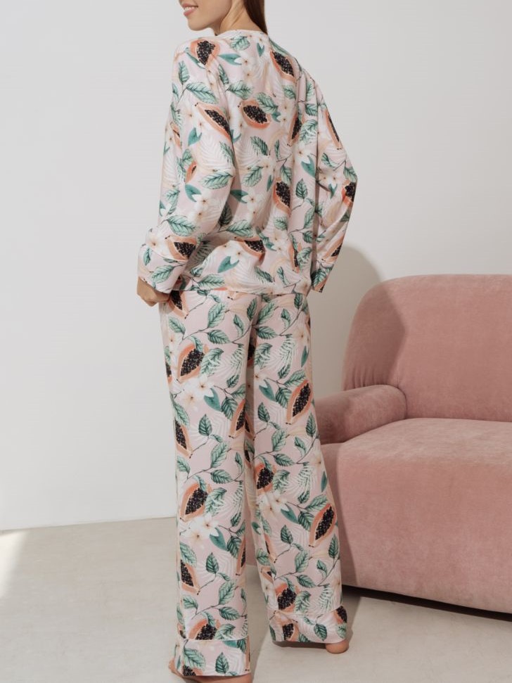 Удобная распашная пижама состоит из свободных брюк с отрезным манжетом и рубашки на пуговицах. По бортам рубашки, манжетам рукава и брюк проложен декоративный кант.