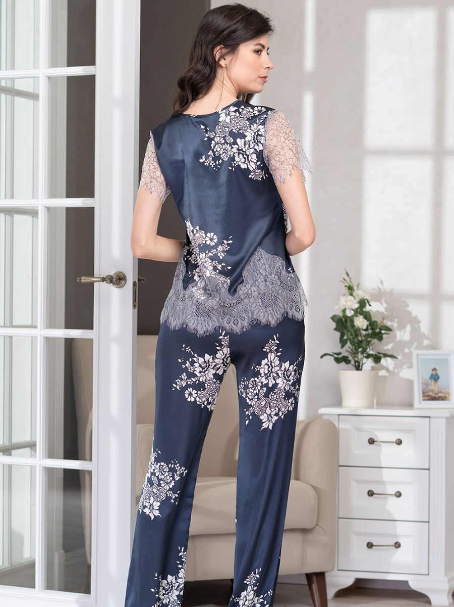 Короткий халат Mia-Amore с рукавами длиной 3/4 выполнен из принтованного смесового полотна. Низ рукавов декорирован изысканным широким вырезным кружевом. Халат запахивается на пояс, в боковых швах карманы.