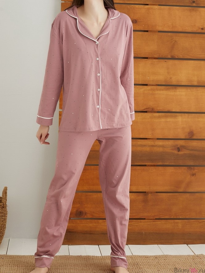 Пижама из хлопковой ткани,на пуговицах с отложным воротником, длинные брюки на резинке.