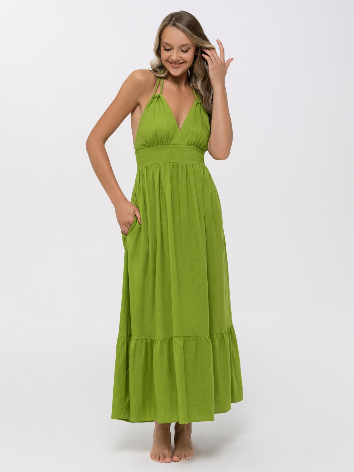 Длинный сарафан полуприлегающего силуэта из льна и вискозы. Боковые карманы. Плетенные бретели-спагетти вокруг шеи. Объем под грудью регулируется широким поясом с завязкой на спине.