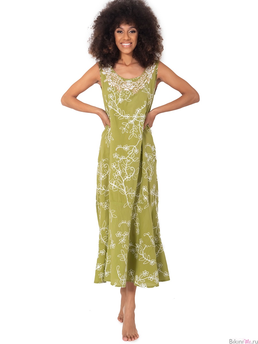 Летнее платье из легкой хлопковой ткани без рукава, изделие украшено вышивкой нитью и бисером вокруг горловины
