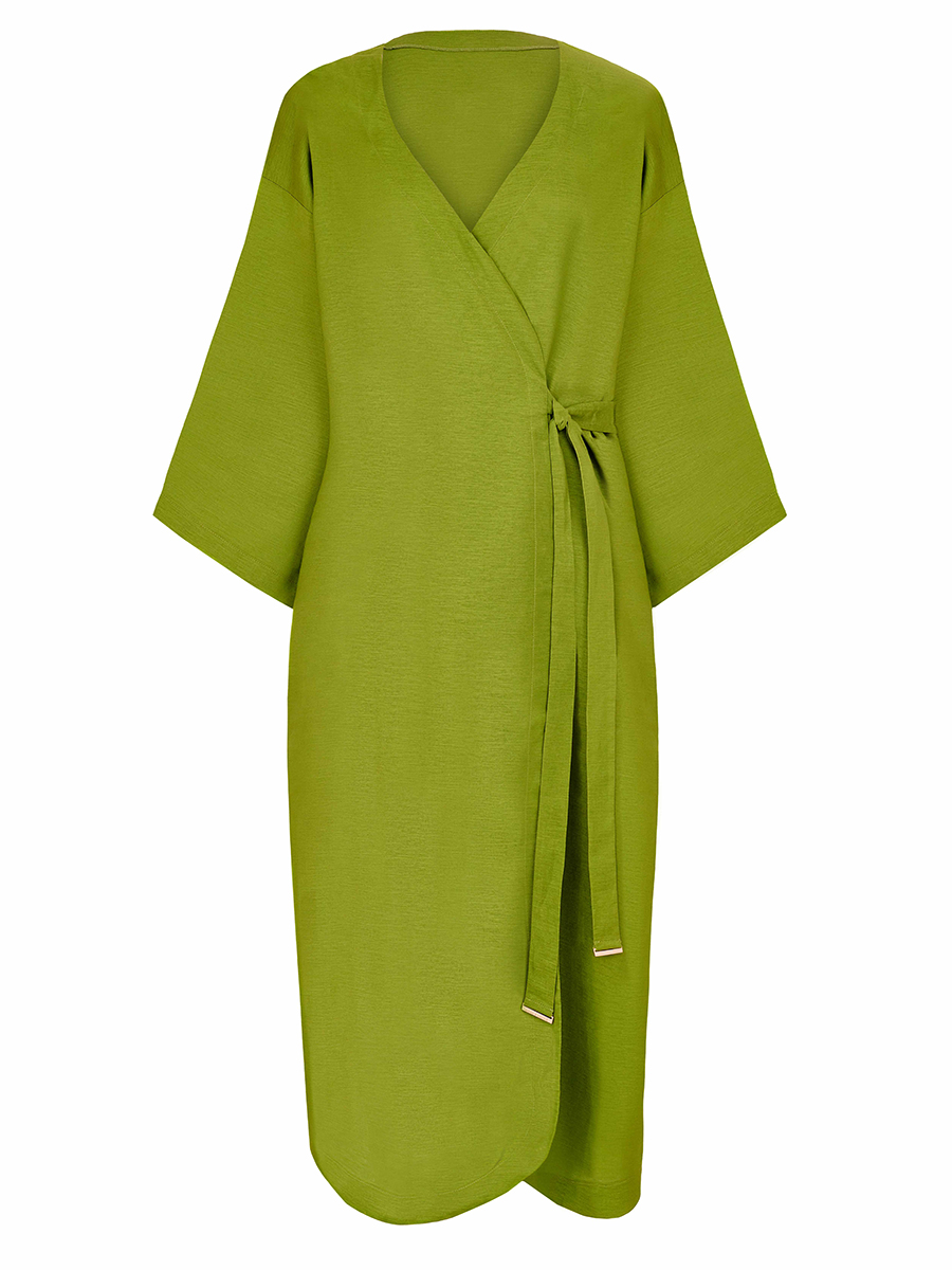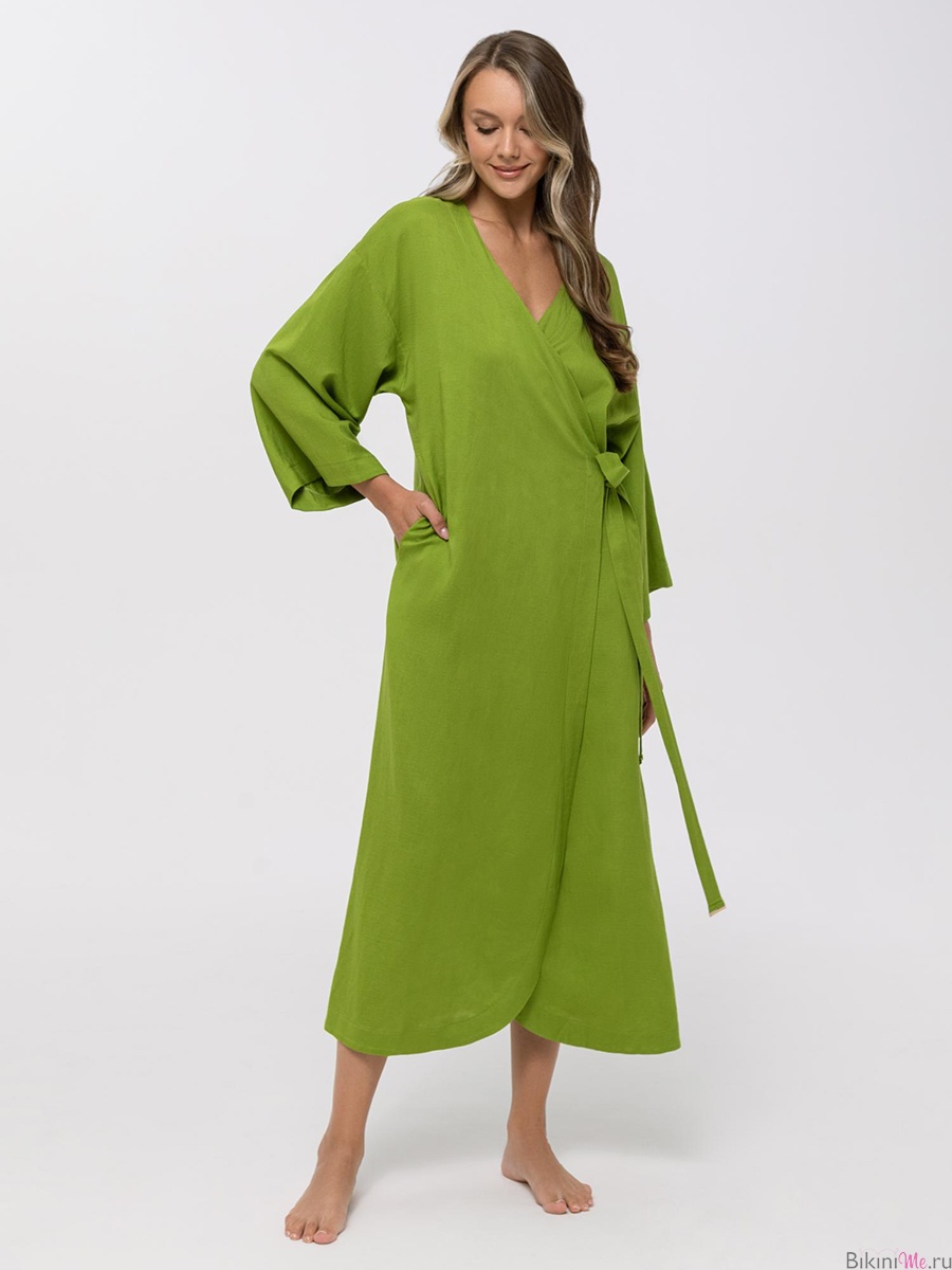 Кимоно свободного кроя из льна и вискозы на запах. Боковые карманы. Втачной рукав 3/4. Длина ниже уровня колен.