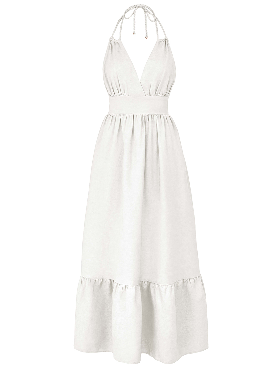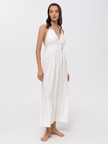 Длинный сарафан полуприлегающего силуэта из льна и вискозы. Боковые карманы. Плетенные бретели-спагетти вокруг шеи. Объем под грудью регулируется широким поясом с завязкой на спине.