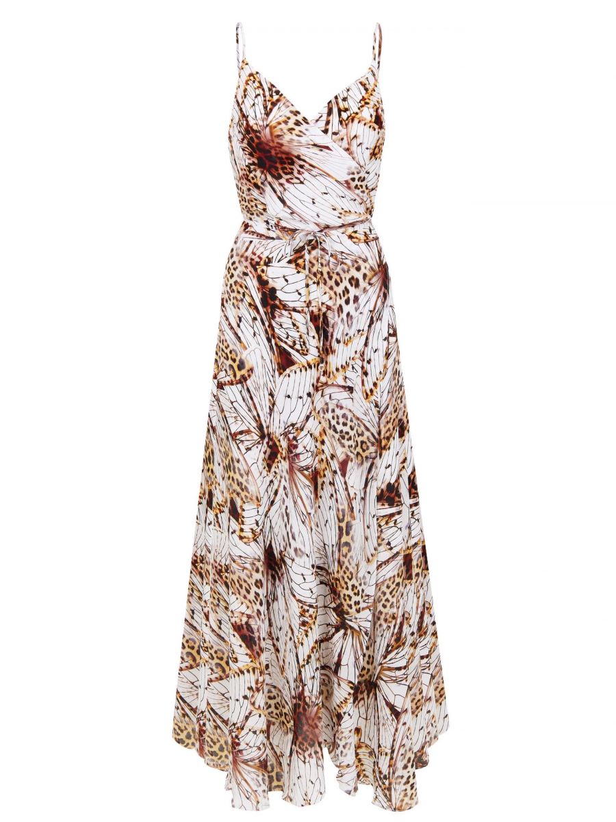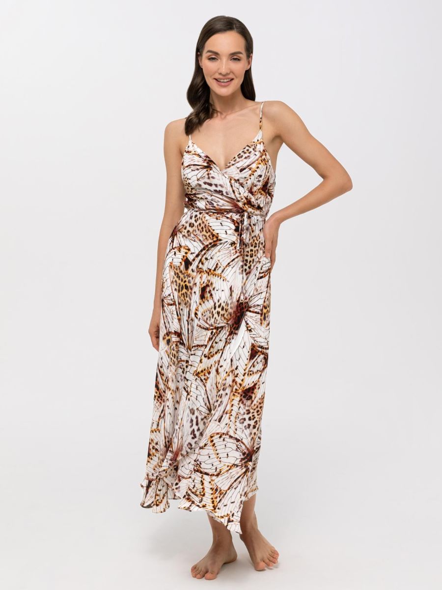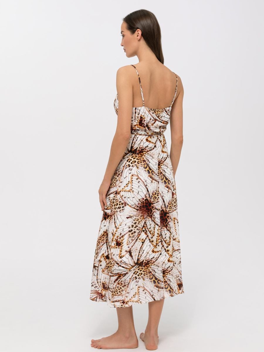 Летнее платье-сарафан из вискозы и шелка на запах. Тонкие регулируемые бретели. V-образный вырез по линии декольте. Длина ниже уровня колен.