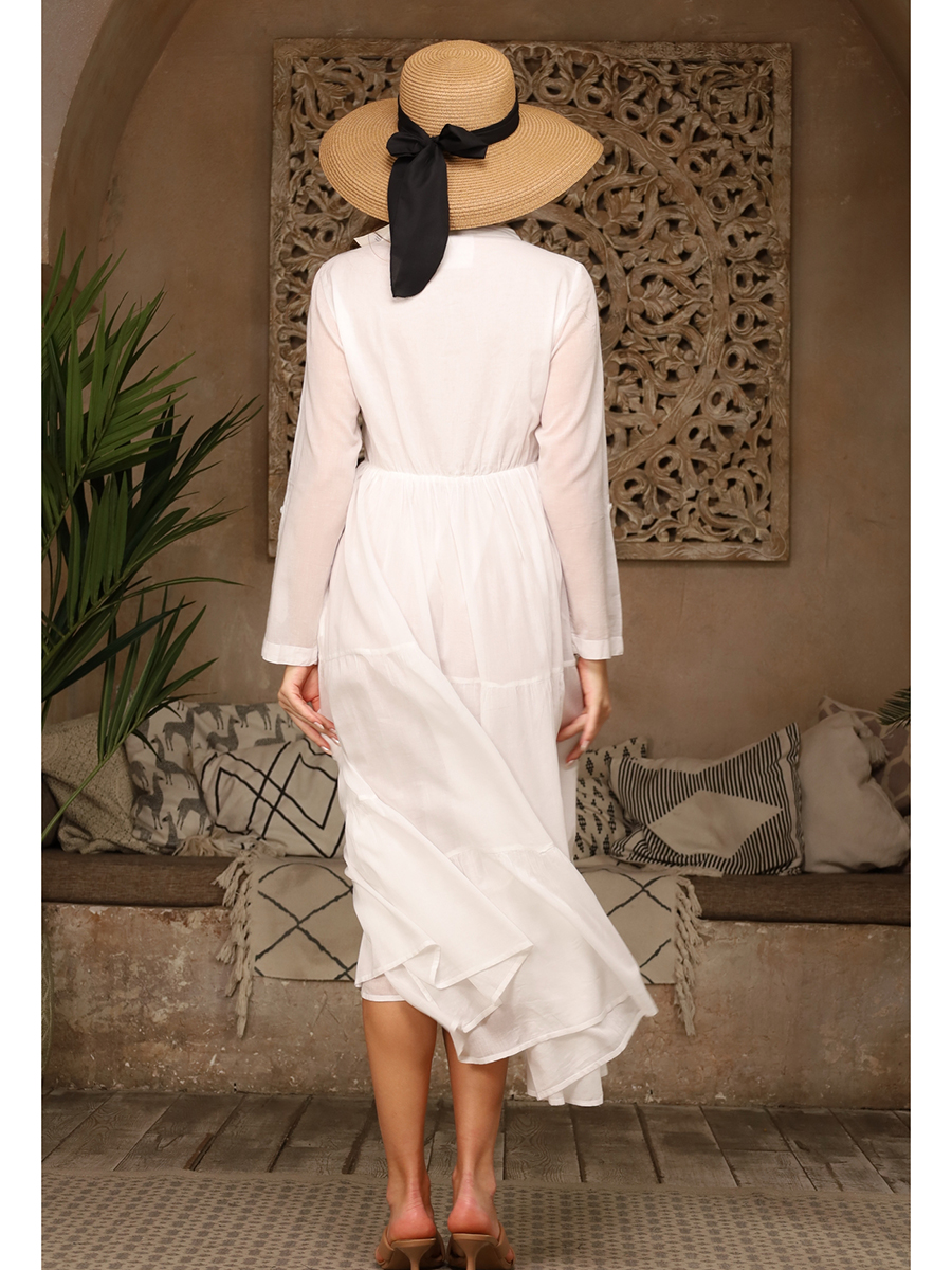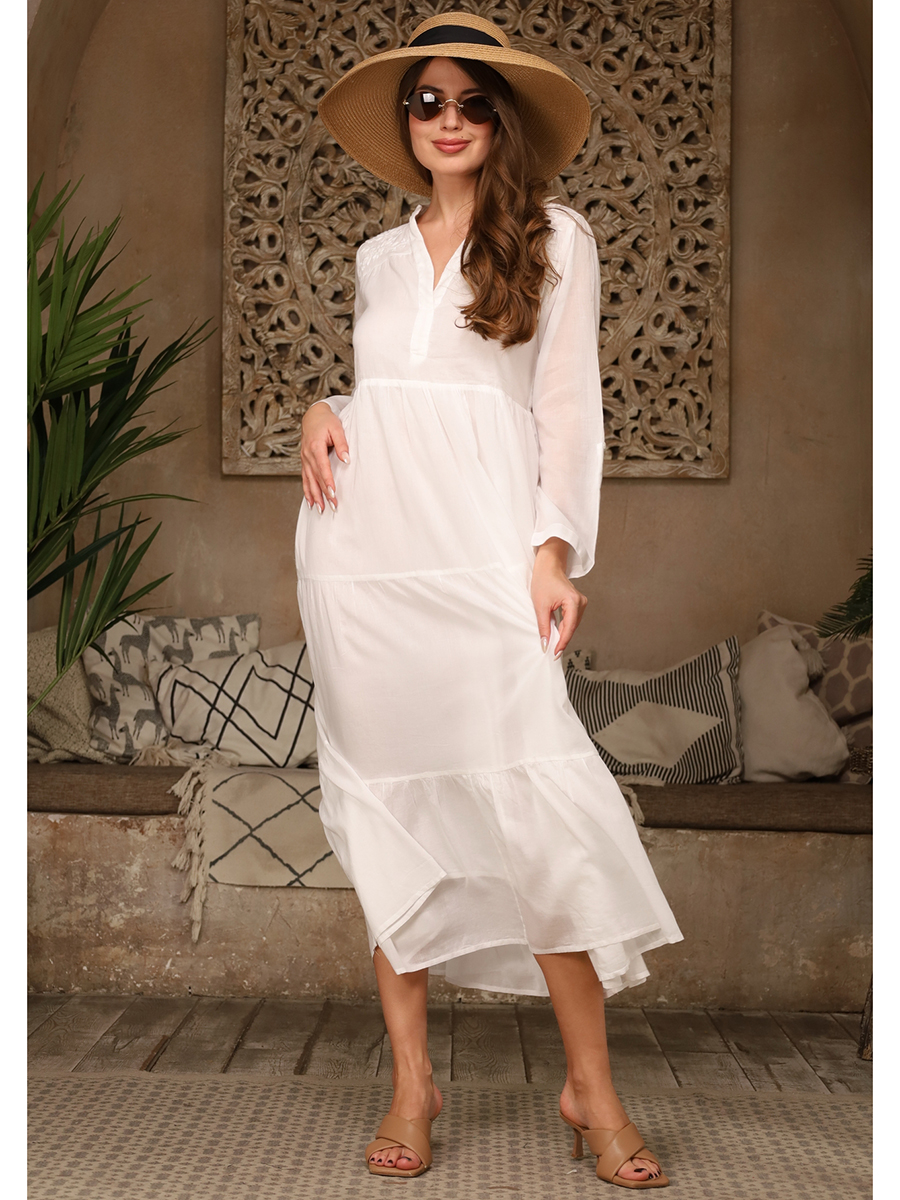 Длинное неразрезное платье из 100% хлопка с хлопковой подкладкой, с длинным рукавом, V-образный вырез,боковые карманы.