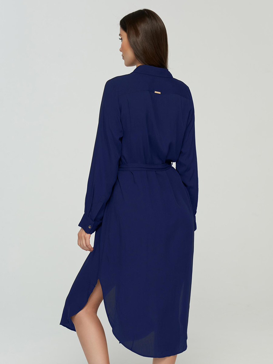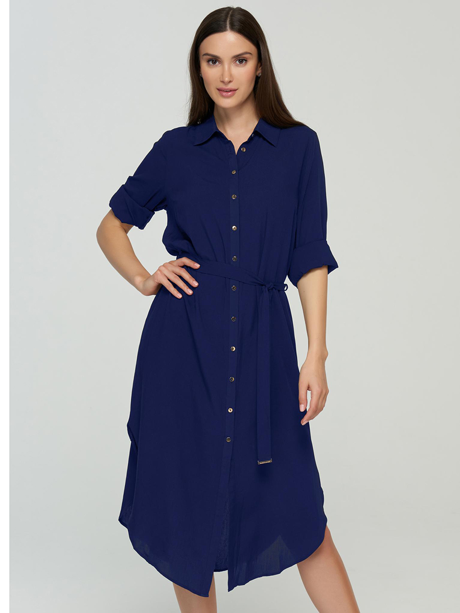 Платье-рубашка макси свободного прямого кроя на пуговицах. Длина ниже уровня колен. Декоративный пояс. Длина рукава регулируется патой с застежкой.