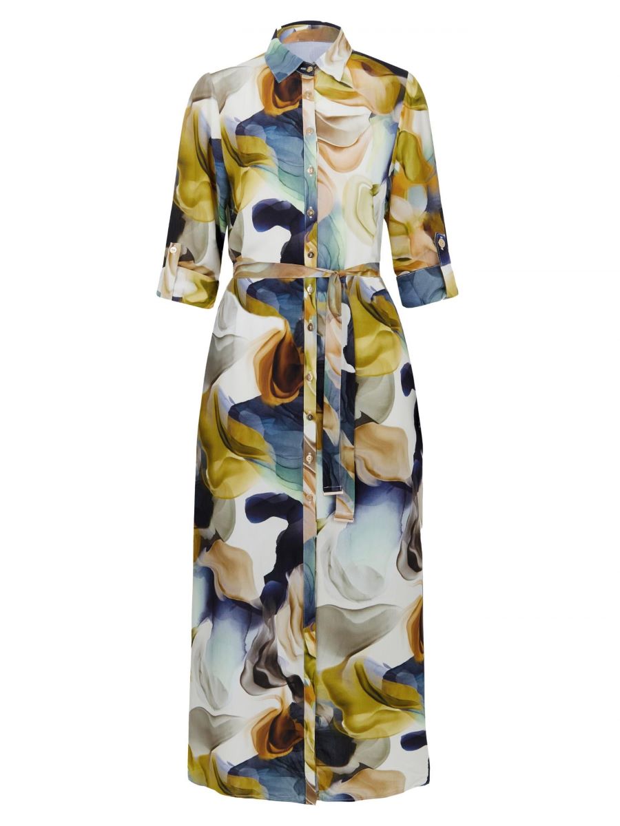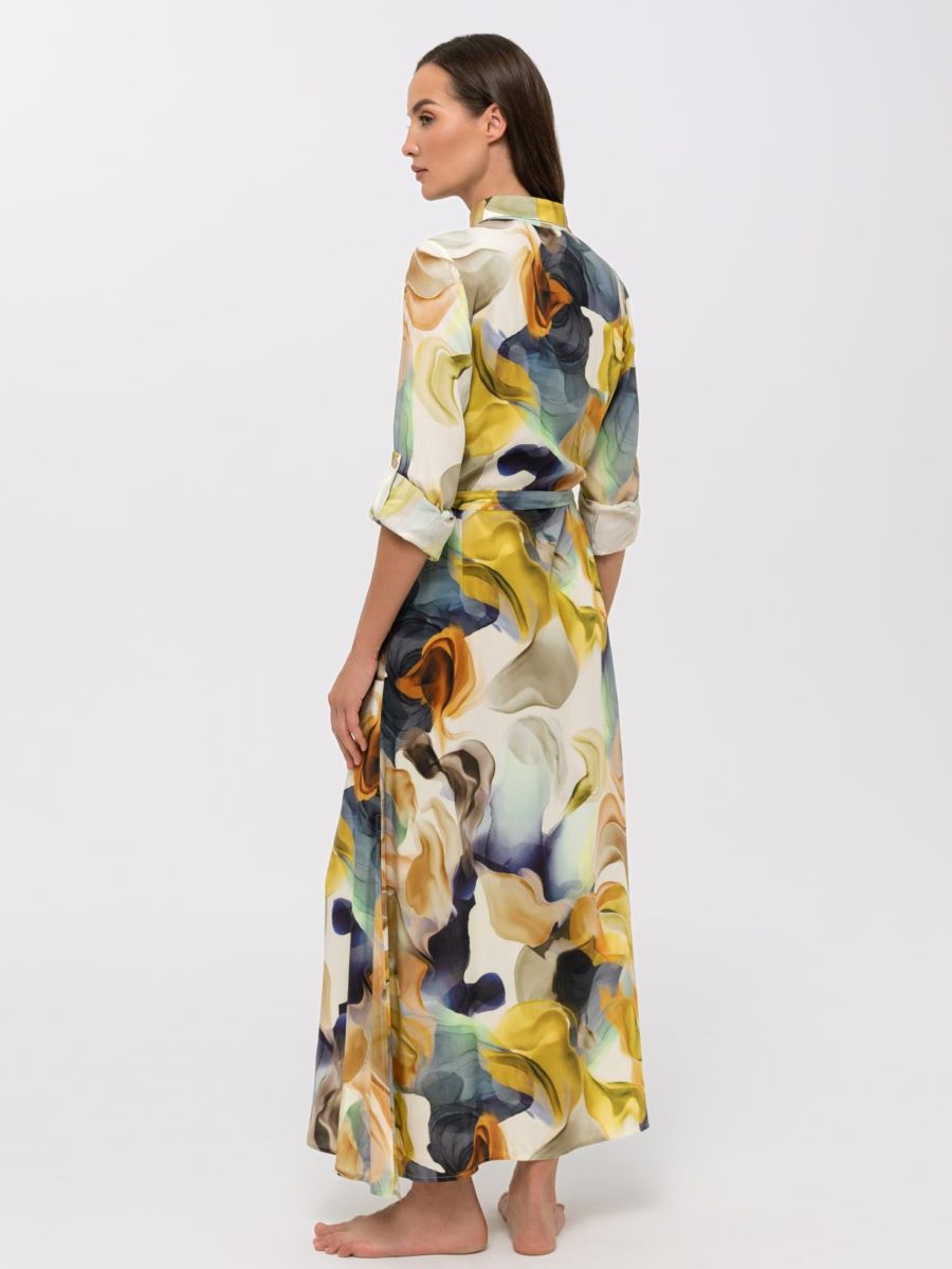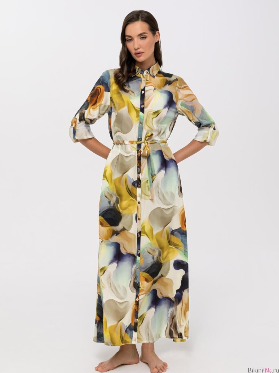 Платье-рубашка макси свободного прямого кроя на пуговицах из вискозы. Длина ниже уровня колен. Декоративный пояс. Длина рукава регулируется патой с застежкой. Боковые карманы.