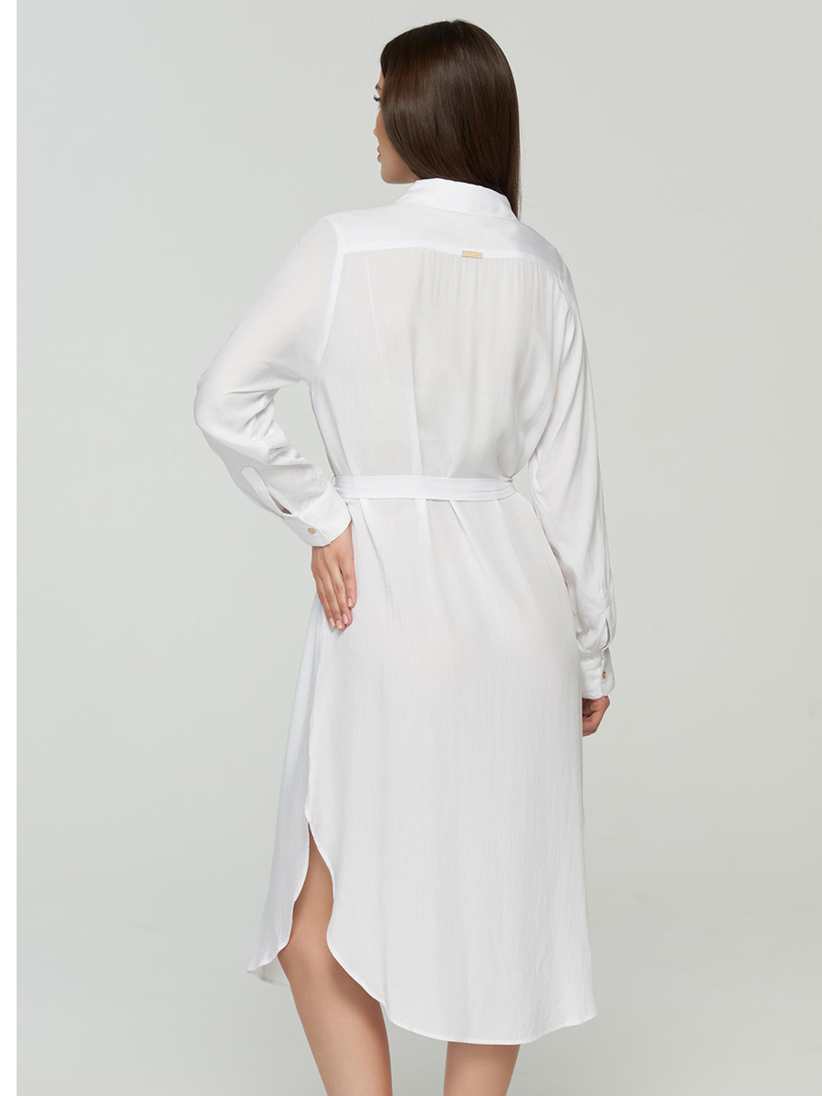 Платье-рубашка макси свободного прямого кроя на пуговицах. Длина ниже уровня колен. Ворот отложной. Декоративный пояс. Длина рукава регулируется патой с застежкой.