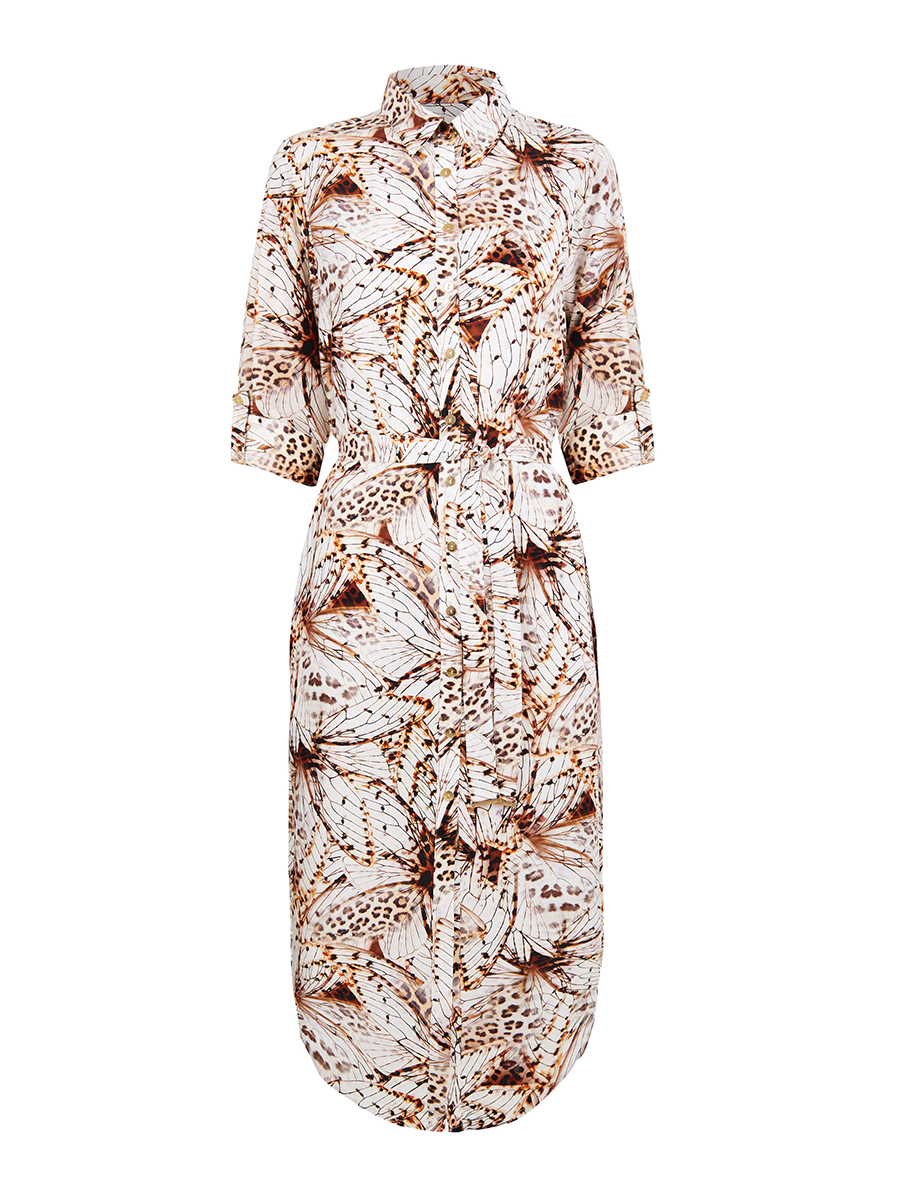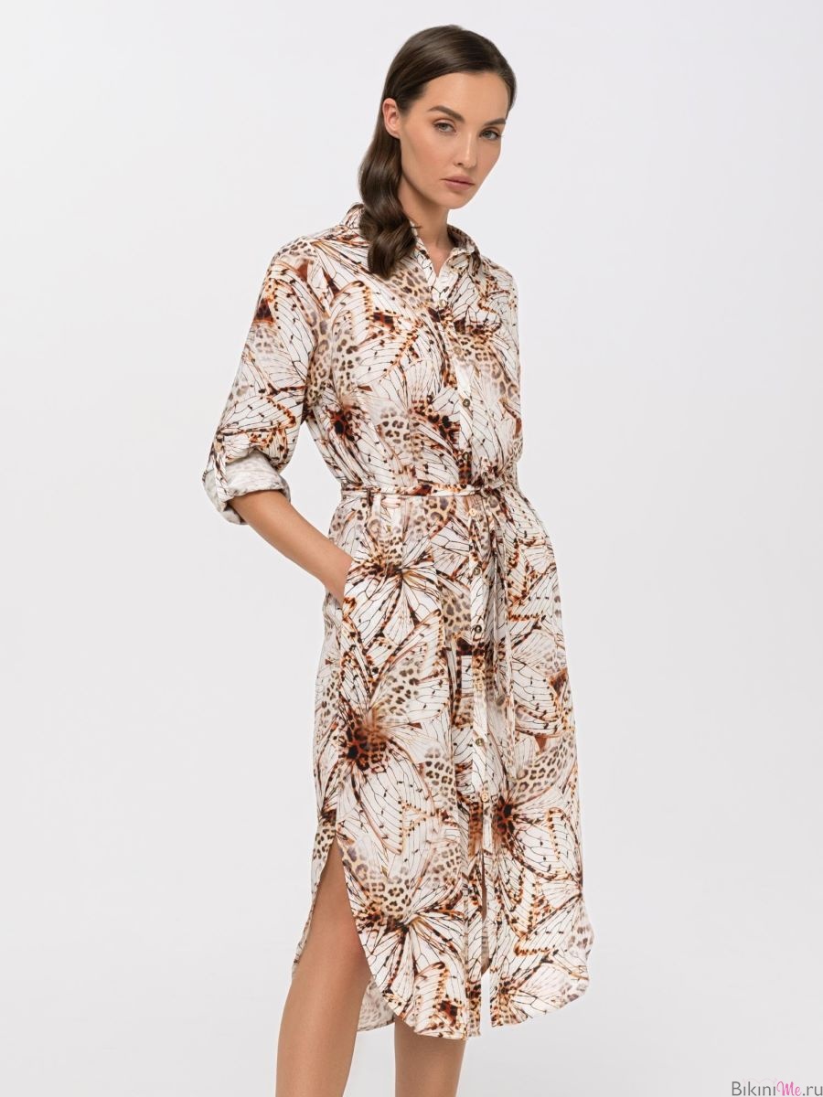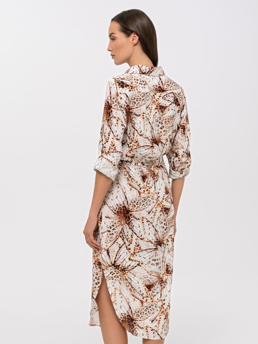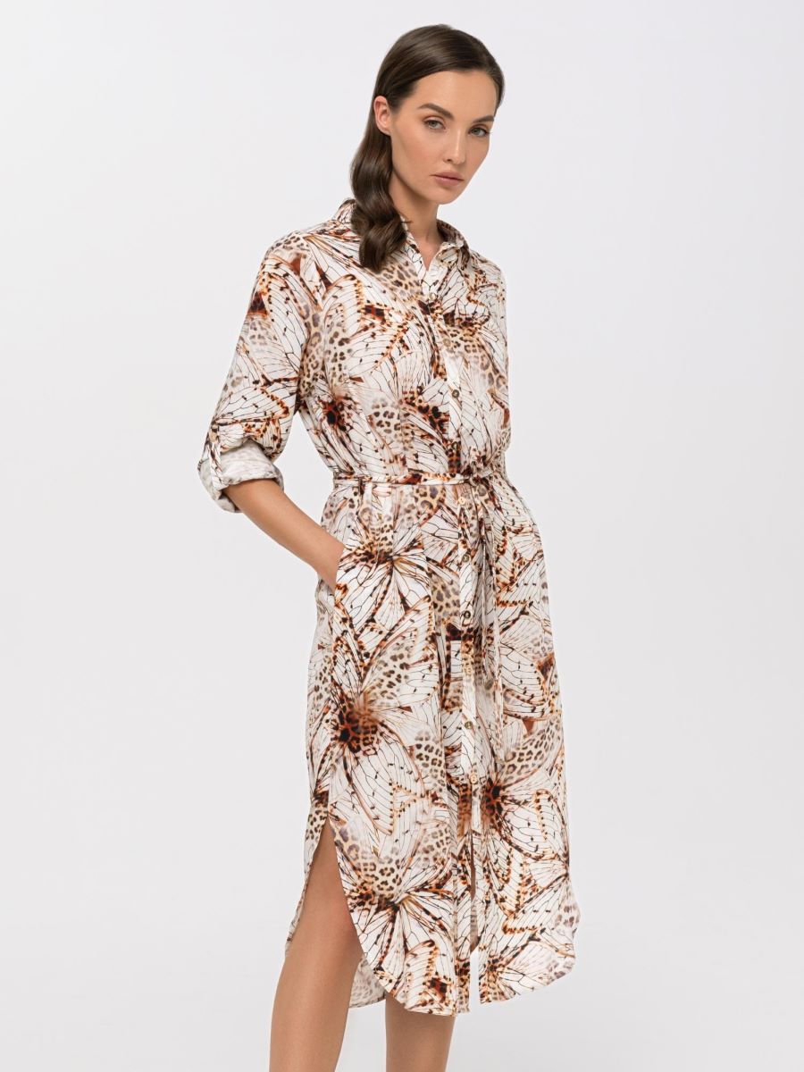 Платье-рубашка на пуговицах из дышащей, мягкой вискозной ткани. Актуальная длина миди. Закругленный подол с разрезами по бокам. Отложной воротник. Длинные рукава с манжетами на пуговицах. Длина рукава регулируется патой с застежкой. Съемный пояс с золотыми пряжками.