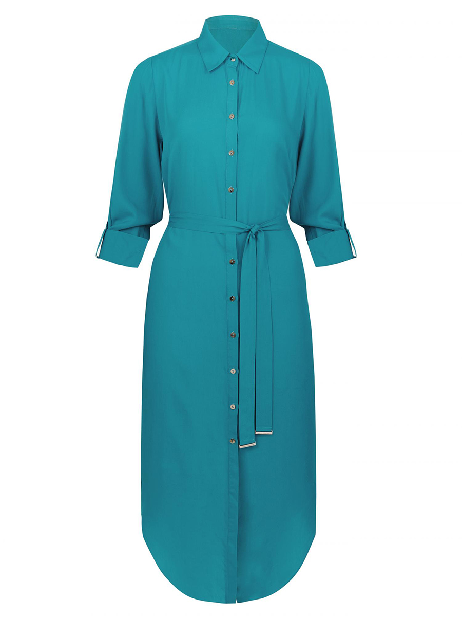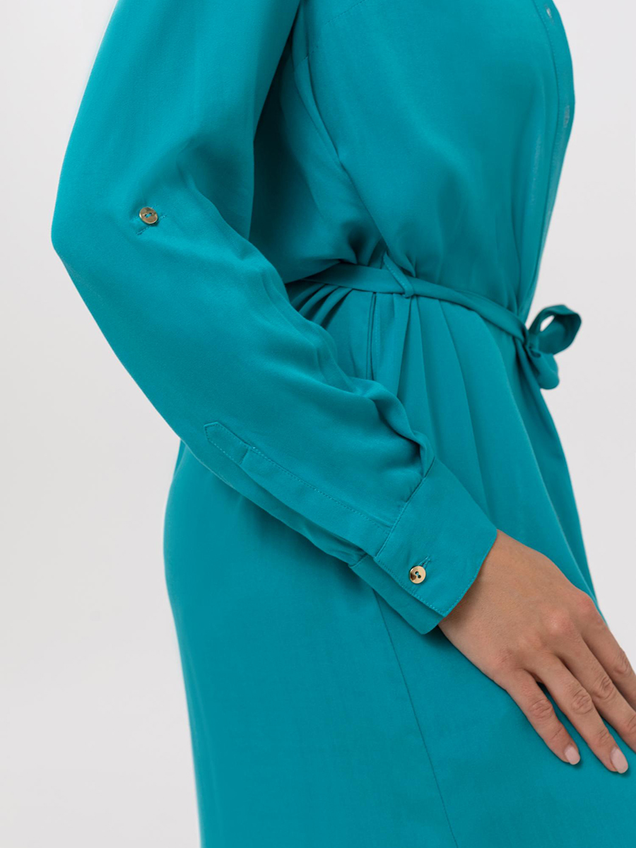 Платье-рубашка на пуговицах из дышащей, мягкой вискозной ткани. Актуальная длина миди. Закругленный подол с разрезами по бокам. Отложной воротник. Длинные рукава с манжетами на пуговицах. Длина рукава регулируется патой с застежкой. Съемный пояс с золотыми пряжками.