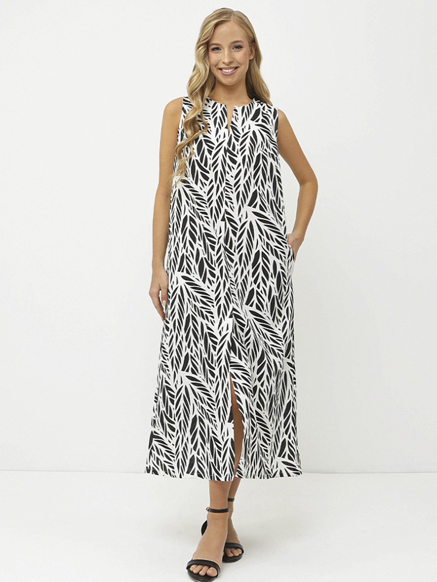 Женское платье итальянского бренда FABRETTI выполнено из 55% льна и 45% вискозы. Удобное, легкое, приятное к телу. Яркий черно-белый флористичный принт — стильный и актуальный тренд. Прямой силуэт платья подчеркивает фигуру, а длина миди делает его универсальным вариантом для различных случаев. Вырез «V-образный», платье без рукавов, что делает его комфортным в жаркую погоду. По бокам платья расположены удобные карманы. Небольшой разрез на подоле добавляет модели динамичности и удобства при ходьбе.