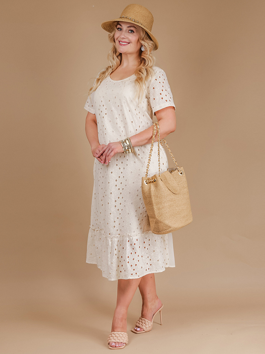 Летнее женское платье средней длинны из легкой хлопковой ткани с перфорацией и вышивкой. По всей длинне изделия есть подкладка