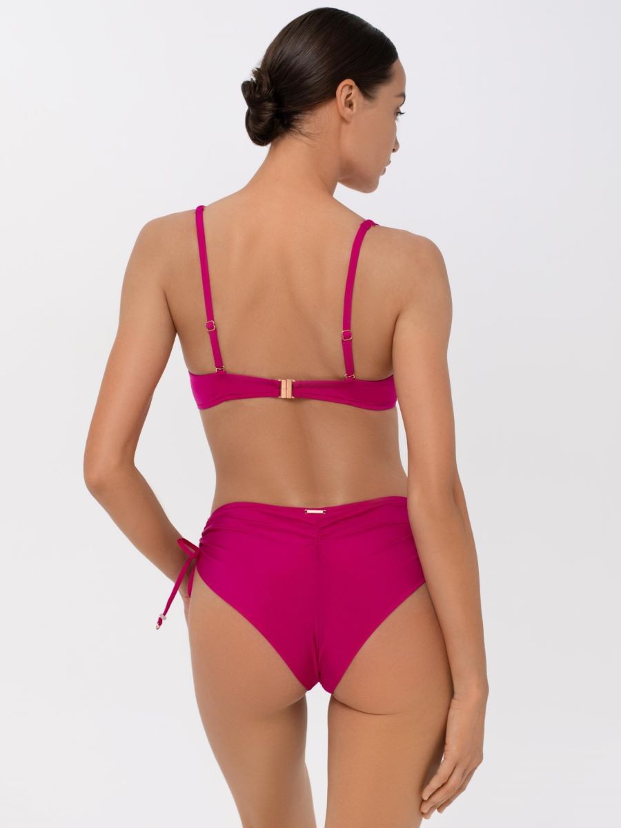 Плавки женские-бразилиана со средней линией талии. Асимметричный крой по передней детали. Высота бока регулируется кулисками. Обработка задней детали в подворот с чистым краем.