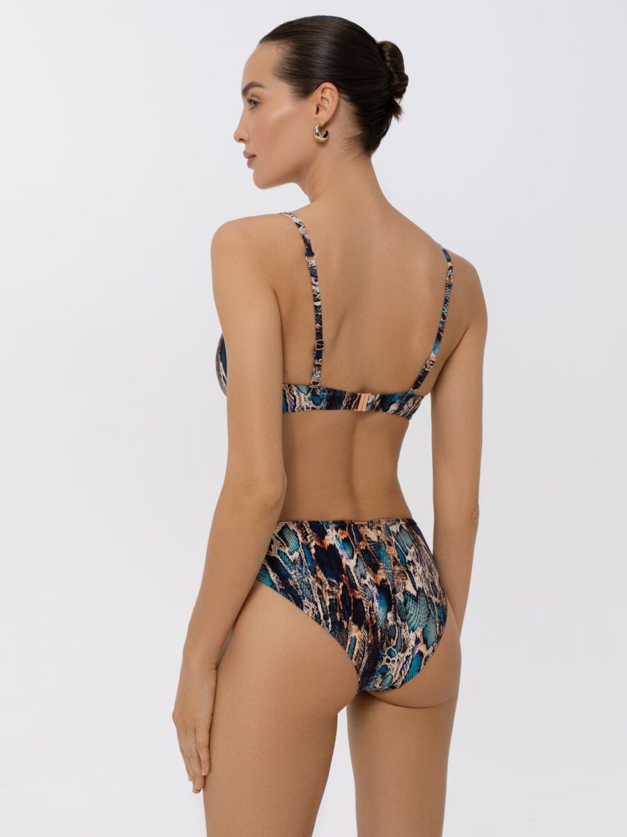Раздельный купальник с анималистическим рисунком под кожу змеи в переливах бирюзовых, лазурных тонов и золотистых оттенков.